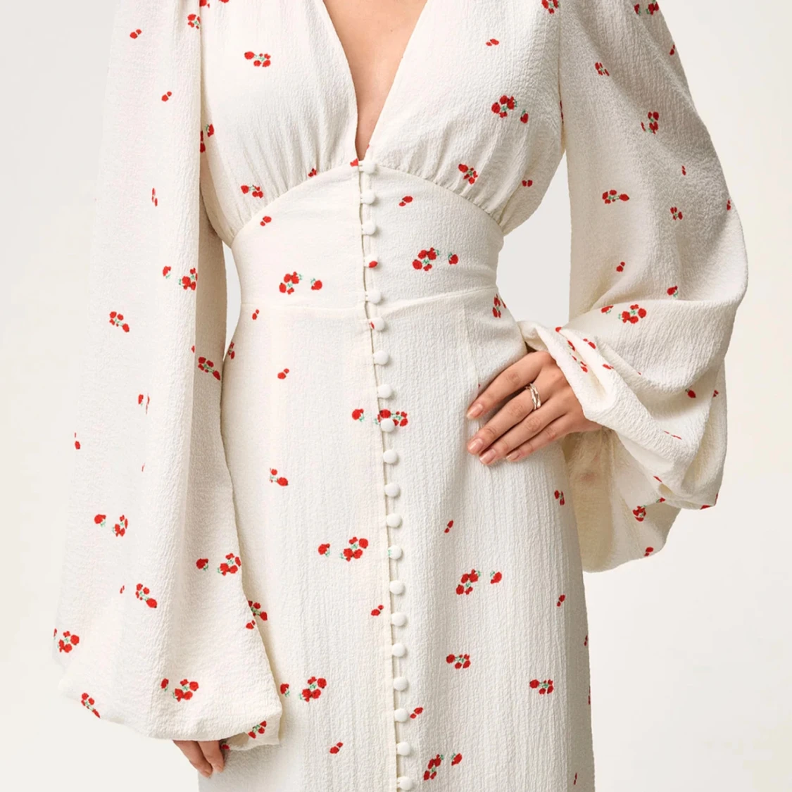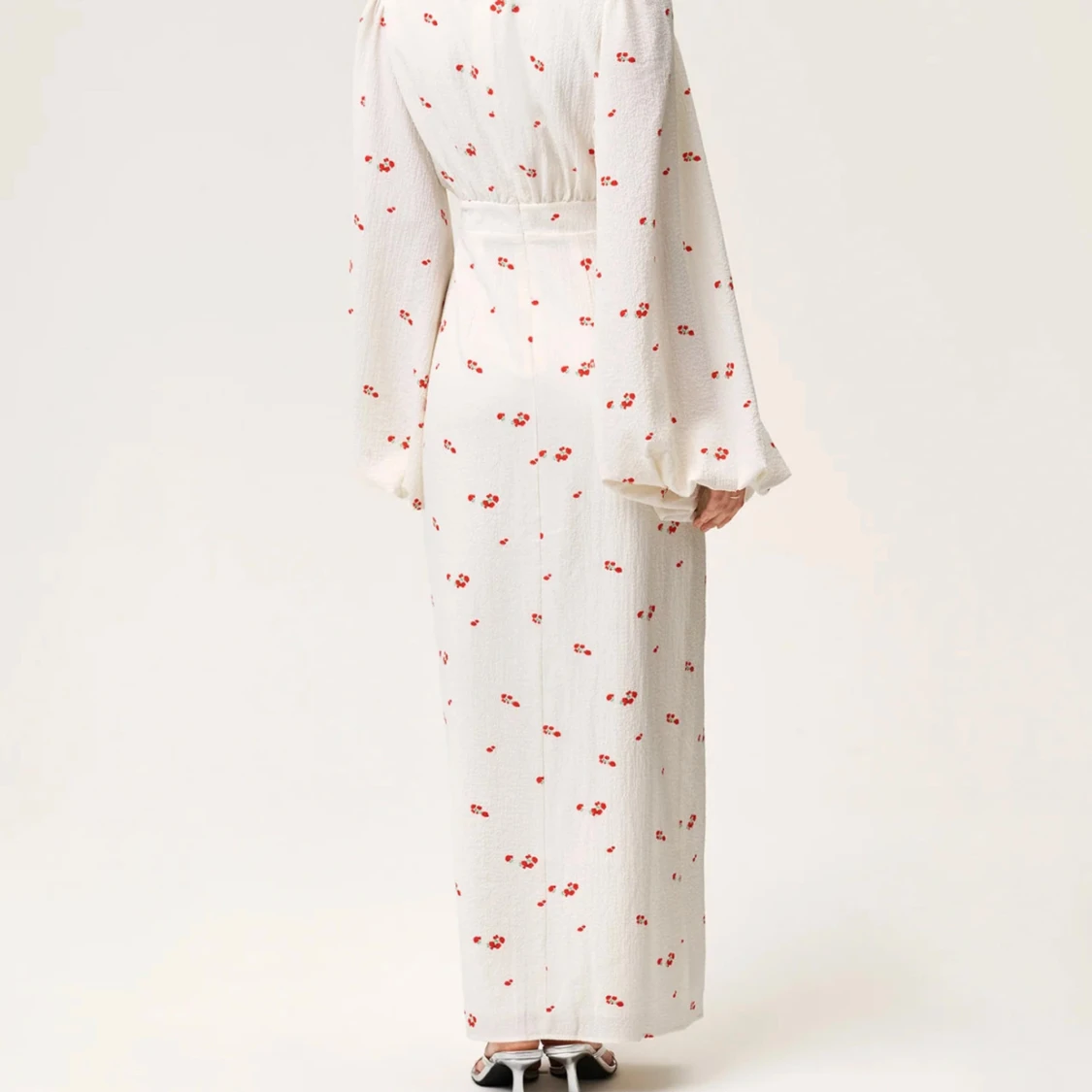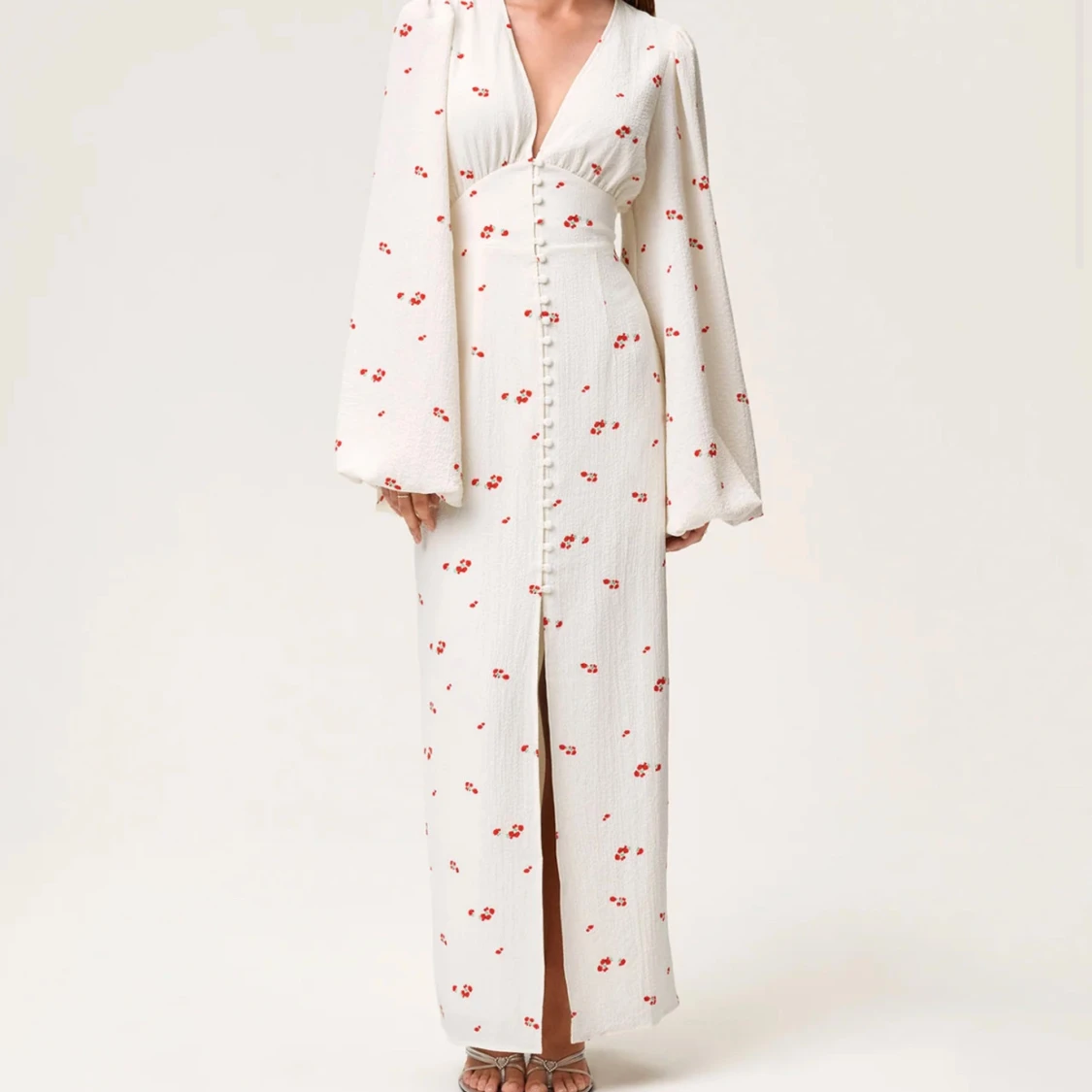 Superfin vit långklänning från Adoore i modellen Positano. Klänningen har röda blommiga detaljer, djup v-ringning, långa vida ärmar och knappar framtill. Sitter snyggt i midjan och har en slits framtill. Perfekt för sommarens alla tillfällen! Priset går att diskuteras! 😁