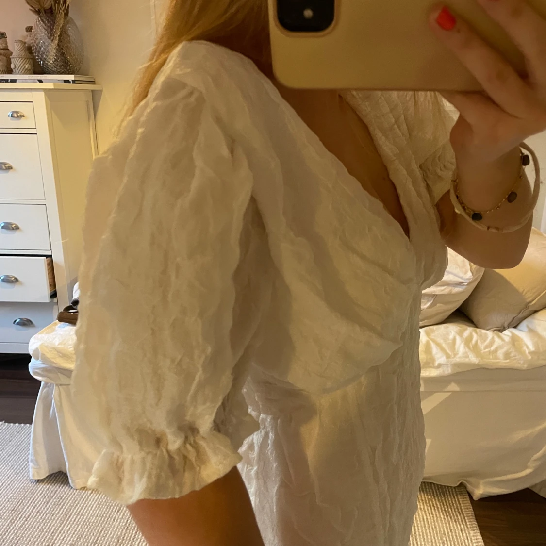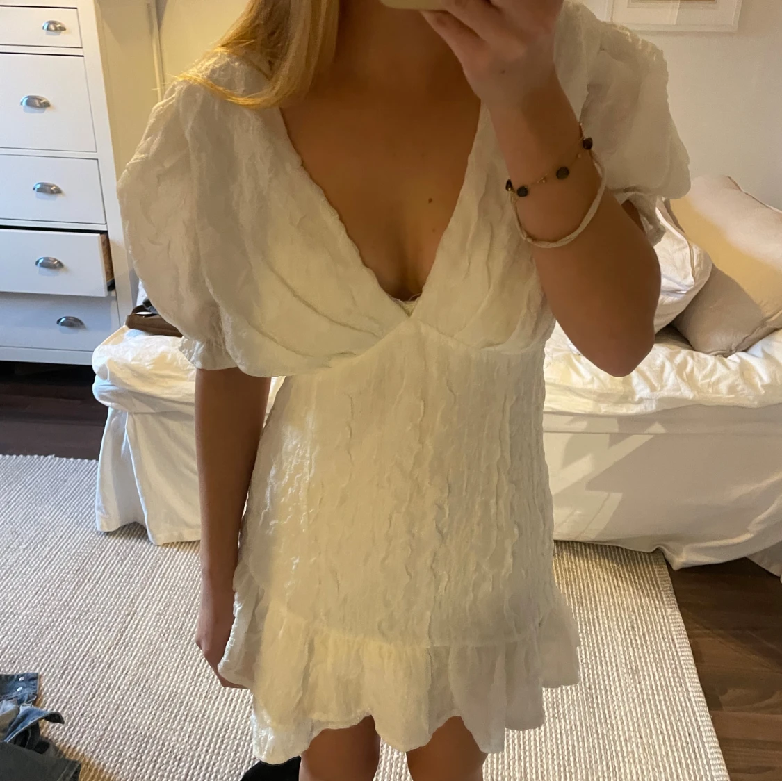 Supersöt vit kort klänning med omlott och djup v-ringning. Klänningen har puffiga korta ärmar med volangkant och ett vågigt, strukturerat tyg som ger en cool look. Perfekt för studenten! Jag är 160 cm som referens