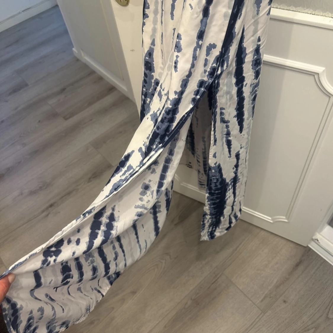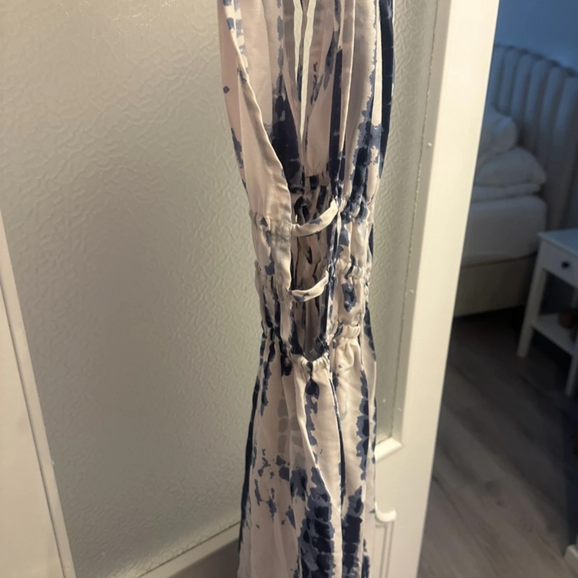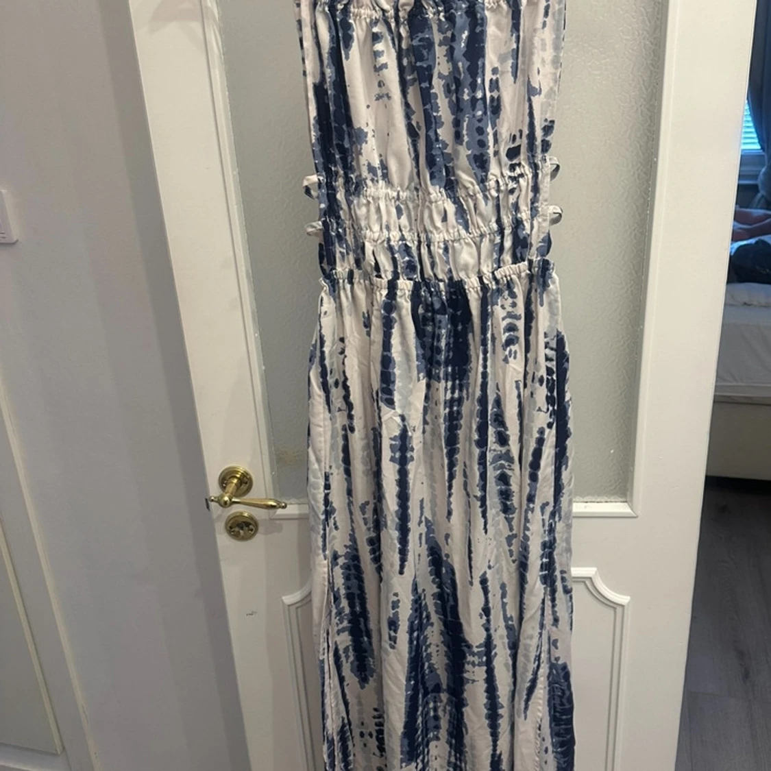 Snygg långklänning i vitt och blått med ett unikt mönster. Klänningen har en smockad midja för en bekväm passform och är ärmlös, vilket gör den perfekt för varmare dagar. Materialet är lätt och luftigt.