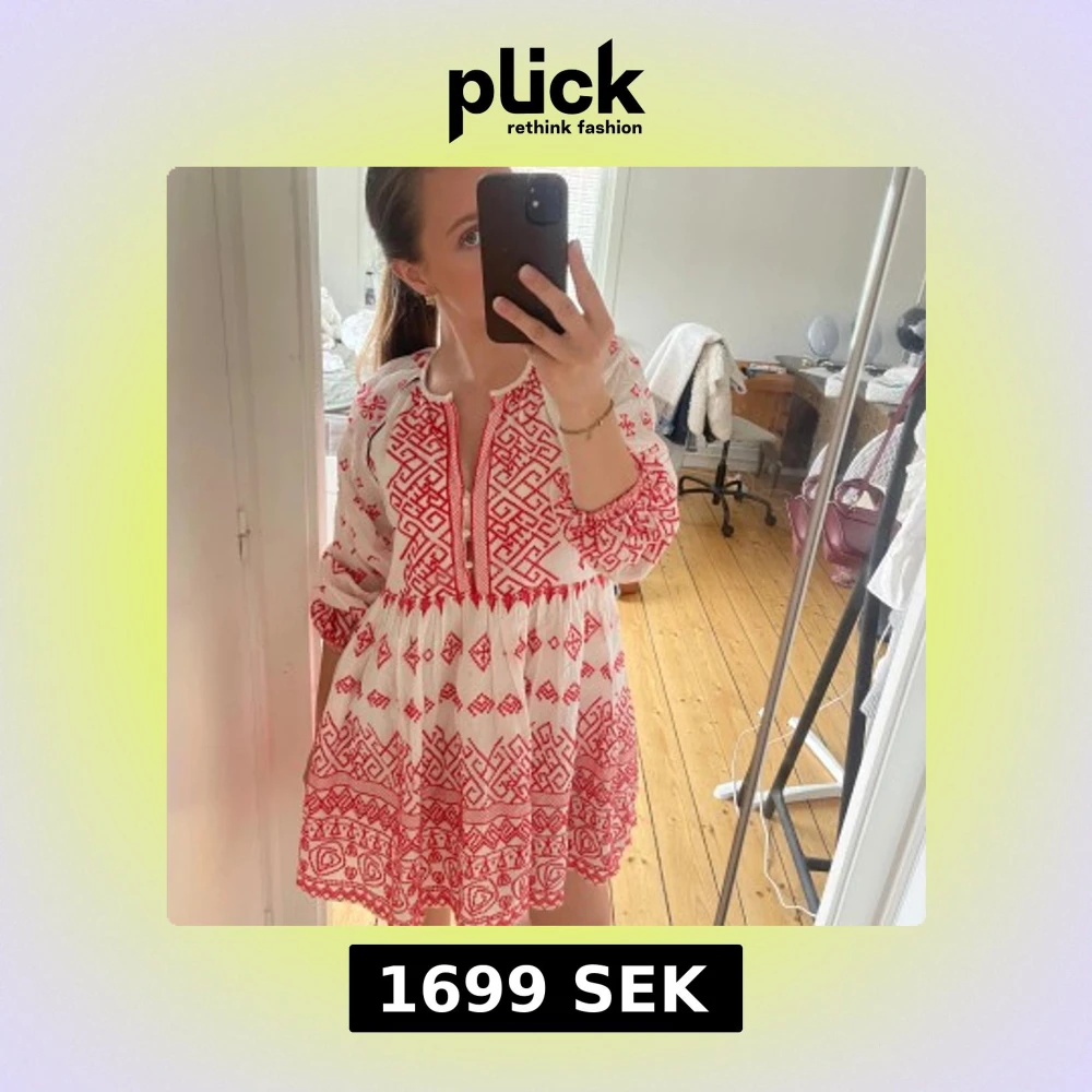 Superfin vit kortklänning med röda broderade mönster och ballongärmar. Klänningen har v-ringning med knappar framtill och ett luftigt, flowy fall. Perfekt för sommarens alla tillfällen och ger en riktigt bohemisk vibe.