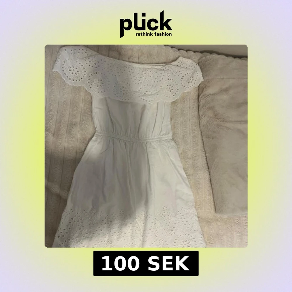 Superfin vit klänning från BikBok med offshoulder-modell och broderade spetsdetaljer. Klänningen har resår i midjan och vackra hålbroderier längs volangen och nederkanten. Perfekt för sommarens alla tillfällen!