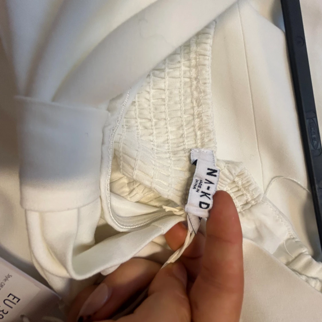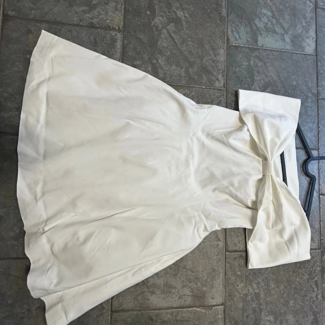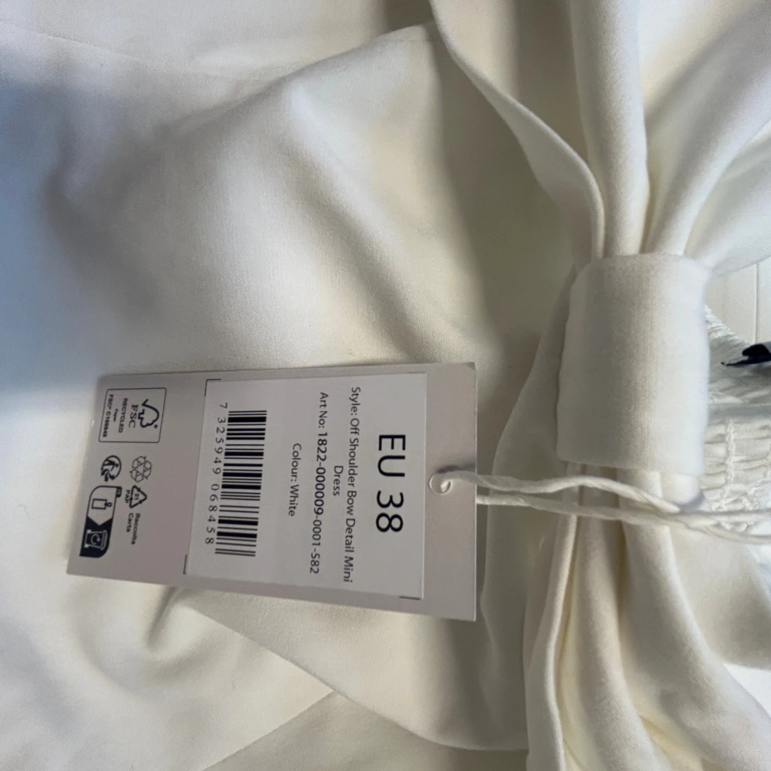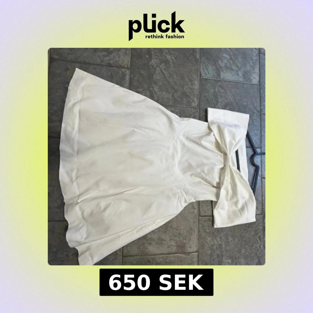 Superfin vit kortklänning från NA-KD med offshoulder-modell och stor rosettdetalj framtill. Klänningen har en figurnära passform upptill och utställd kjol. Perfekt till studenten! Aldrig använd! Nypris 800kr.
