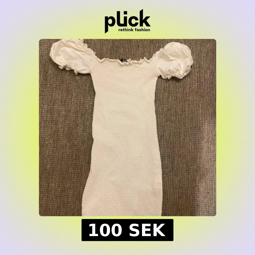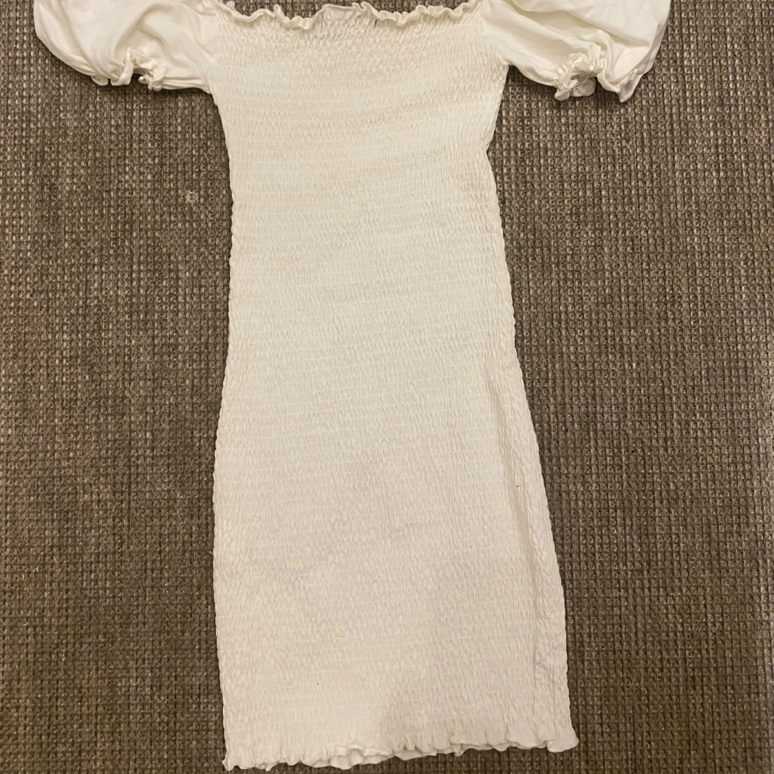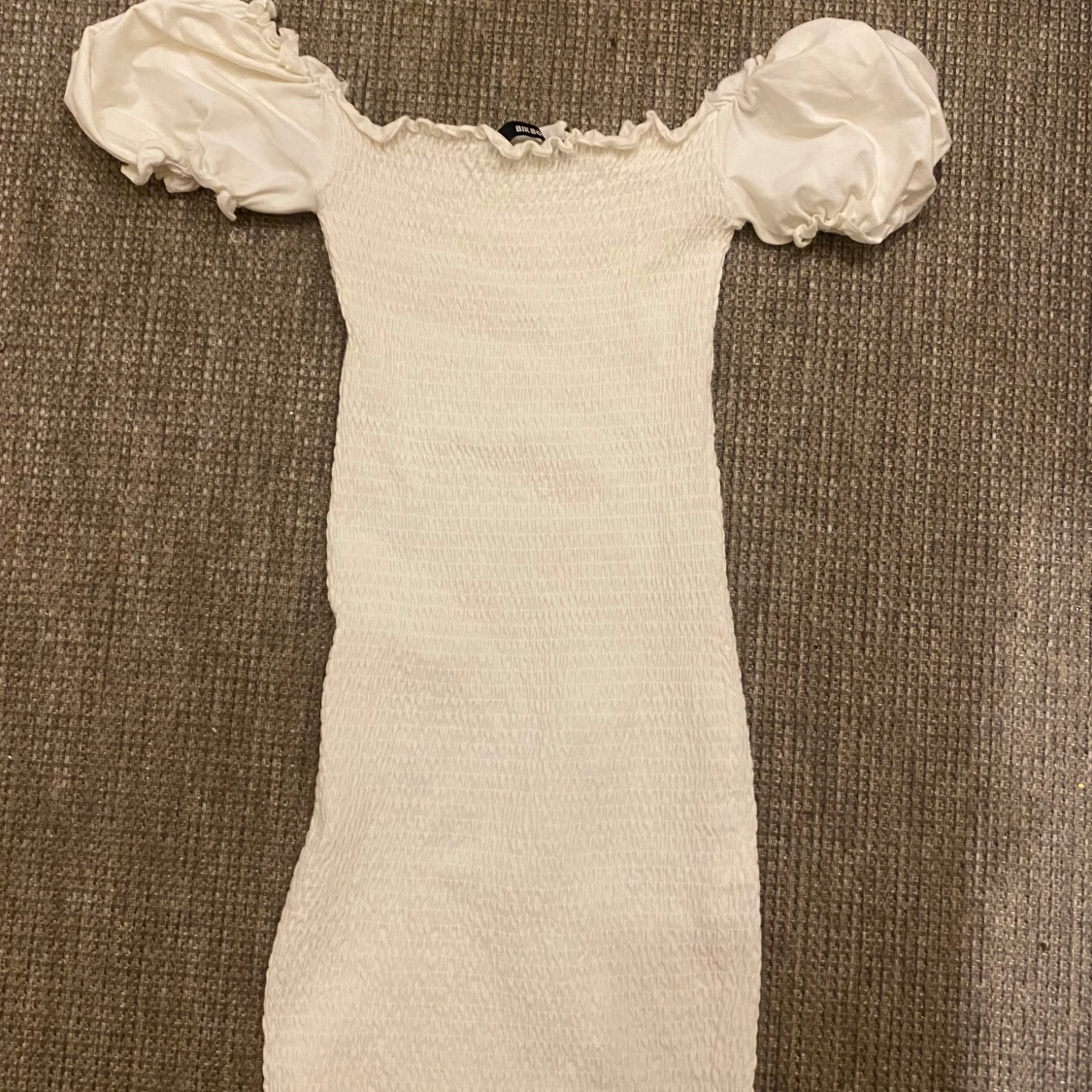 vit klänning med offshoulder-design och puffiga kortärmar, tight passform. Köpt från bikbok.