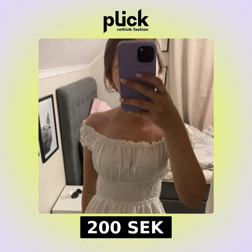 Supersöt vit kortklänning med offshoulder och volangdetaljer.