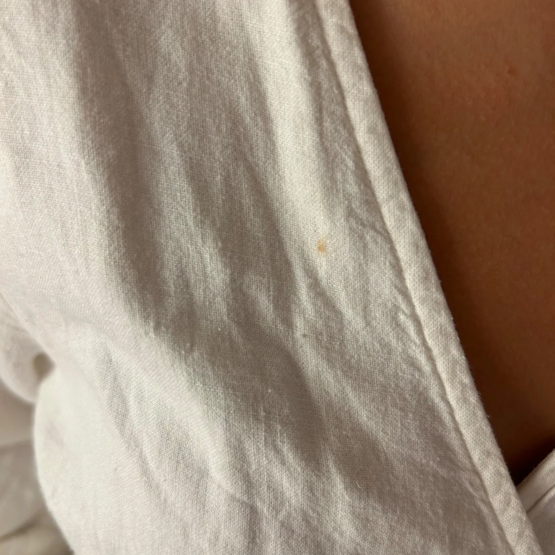 En super fin vit omlott klänning i storlek M den har några fläckar men de kan nog gå bort med rätt tvättmedel