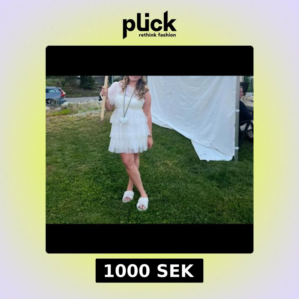 Superfin vit kortklänning från By Malina Bridal med lager på lager av tyll, oneshoulder och volangdetaljer. Klänningen är tillsydd under armen och därmed passar en L. Som även syns på bilderna.