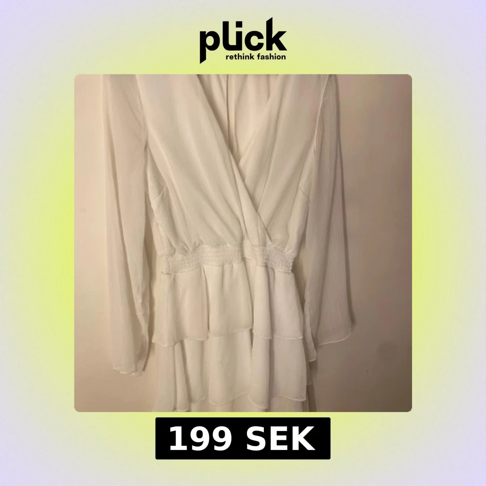Elegant vit omlottklänning från Bubbleroom med långa ärmar och smockdetaljer i midjan. Klänningen har en v-ringad design och ett flödande tyg som ger en luftig känsla. Endast använd 1 gång.