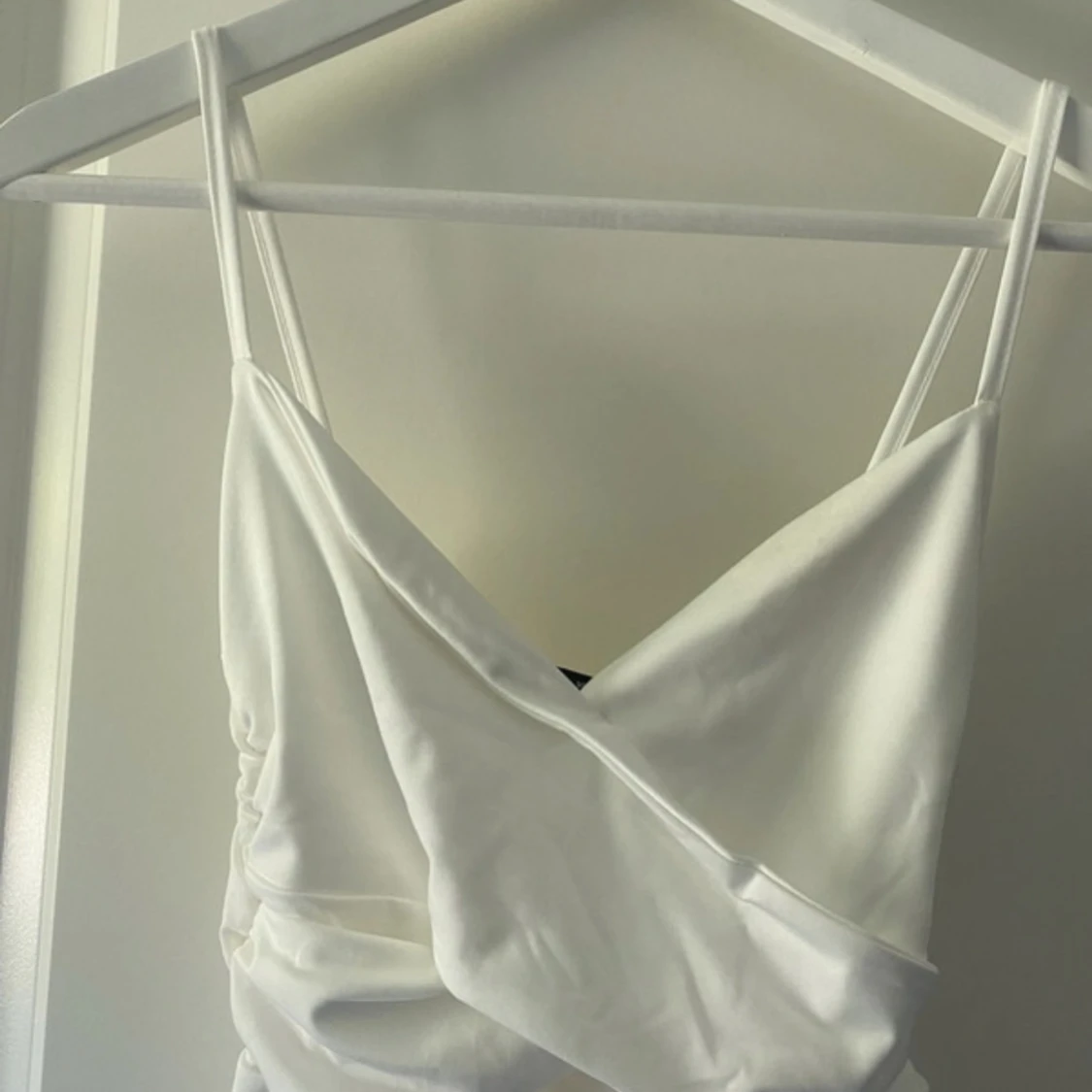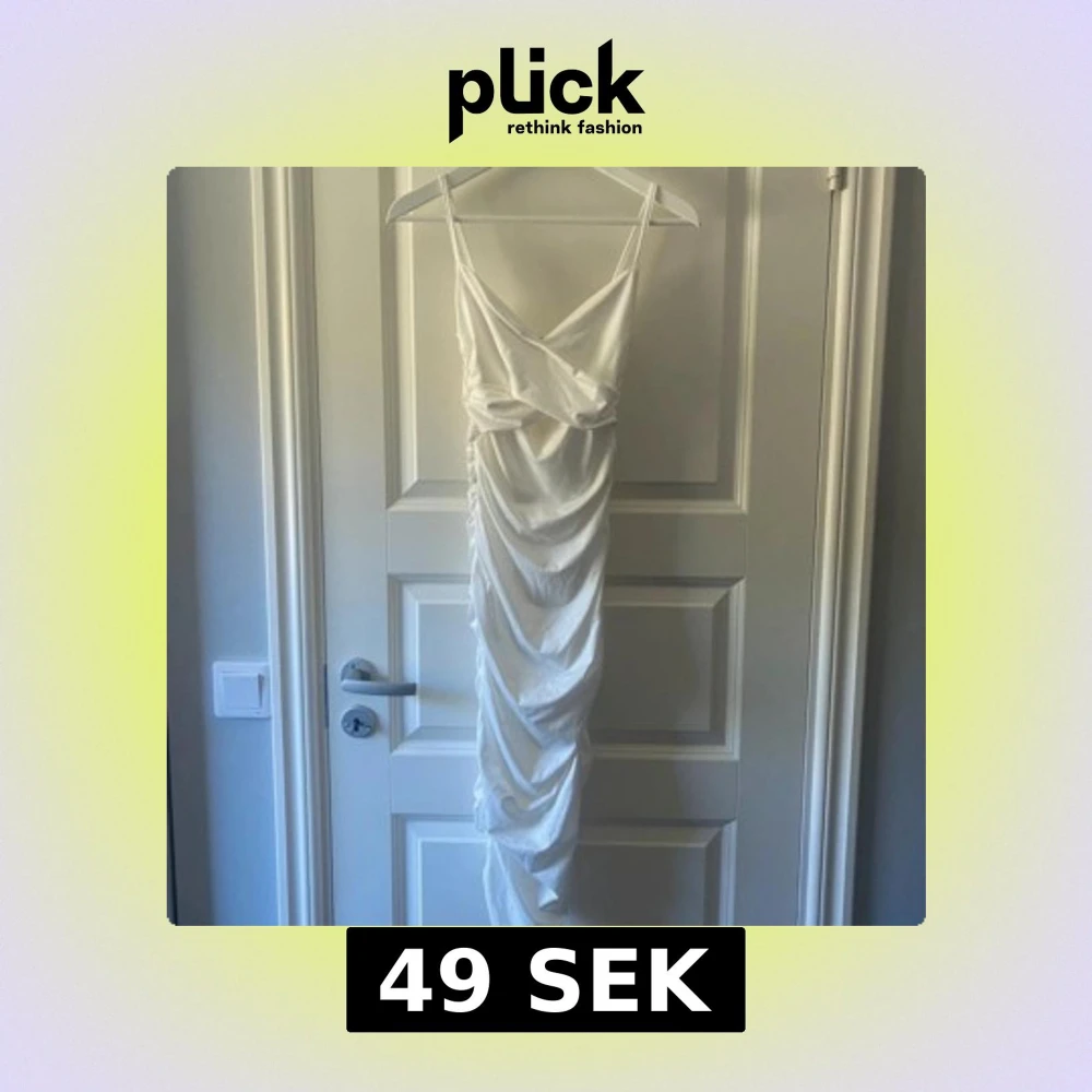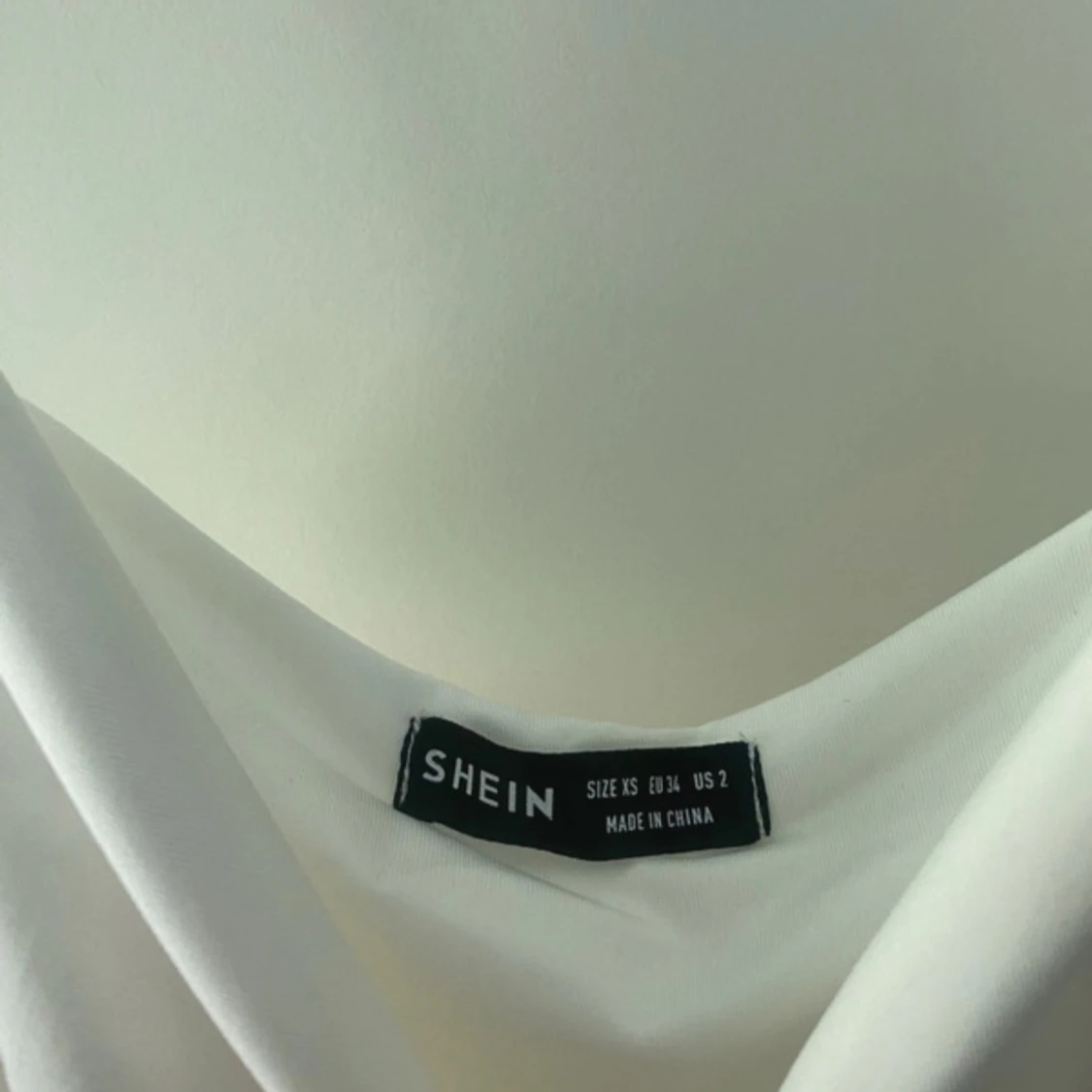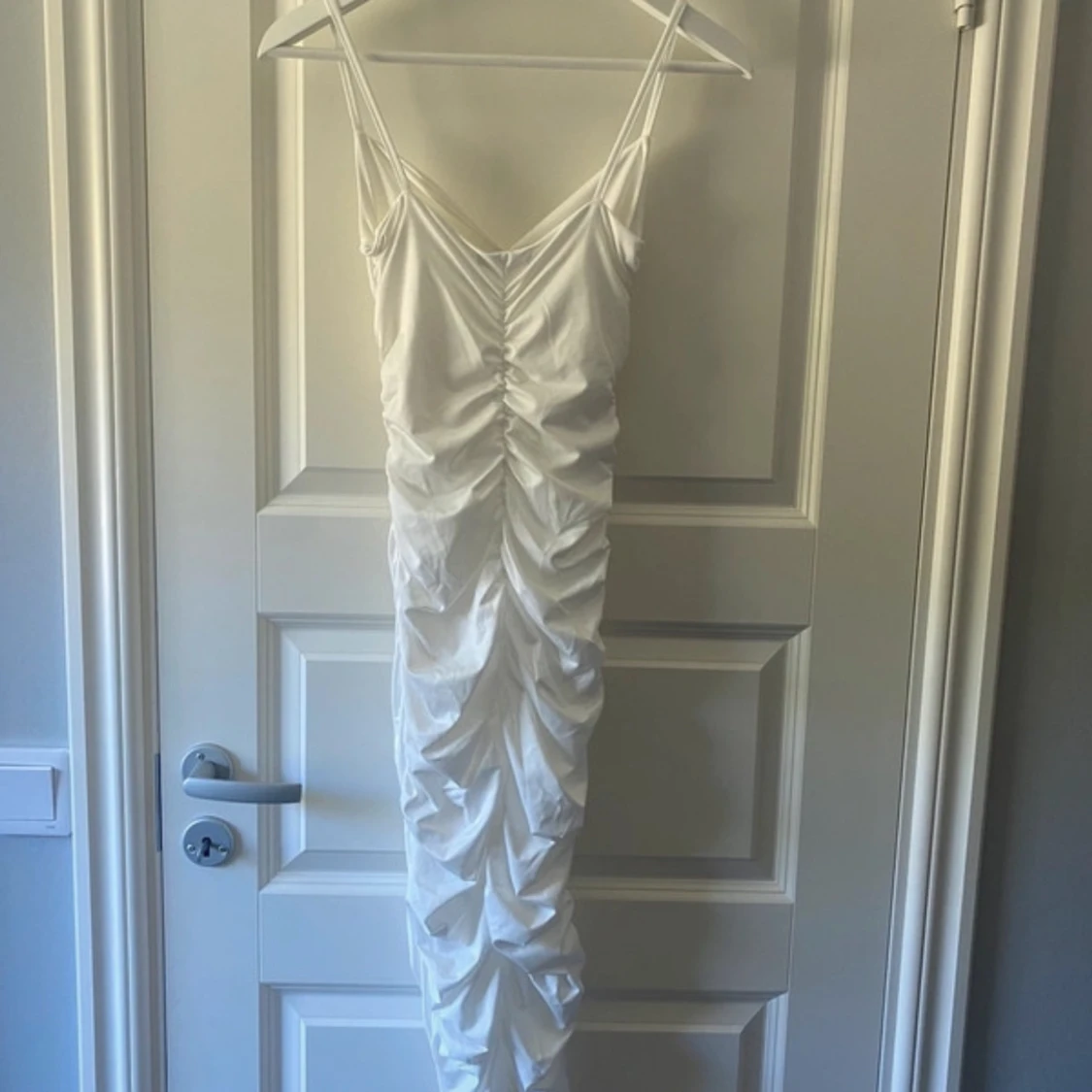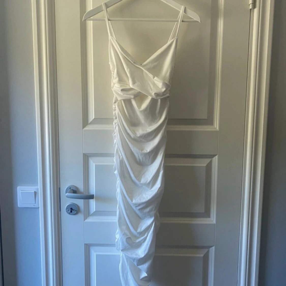 Säljer en lång vit klänning från SHEIN i storlek XS. Klänningen har smala axelband, omlott upptill och snygg rynkad effekt längs hela framsidan. Materialet är mjukt och har en lätt satinliknande känsla. Perfekt för dig som vill ha en elegant och trendig look.