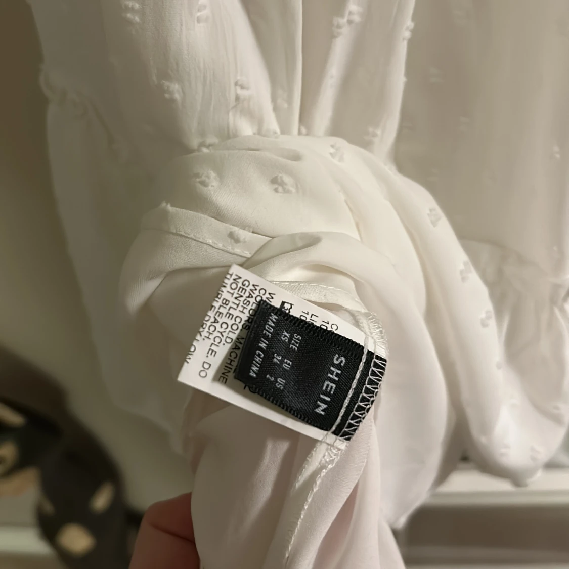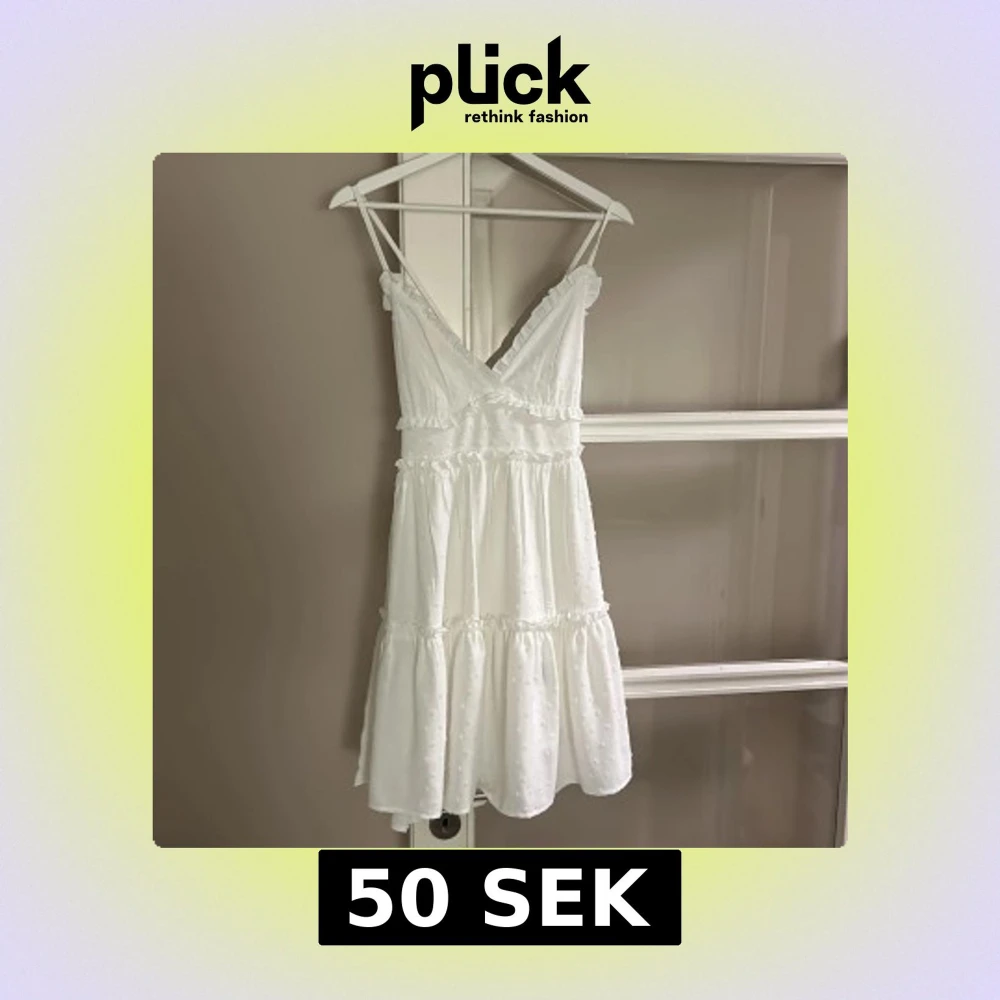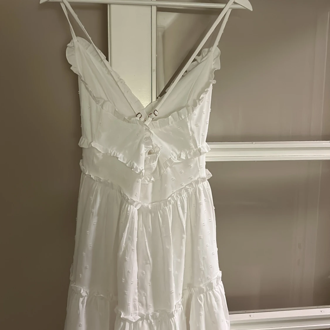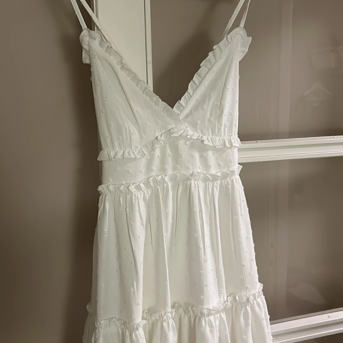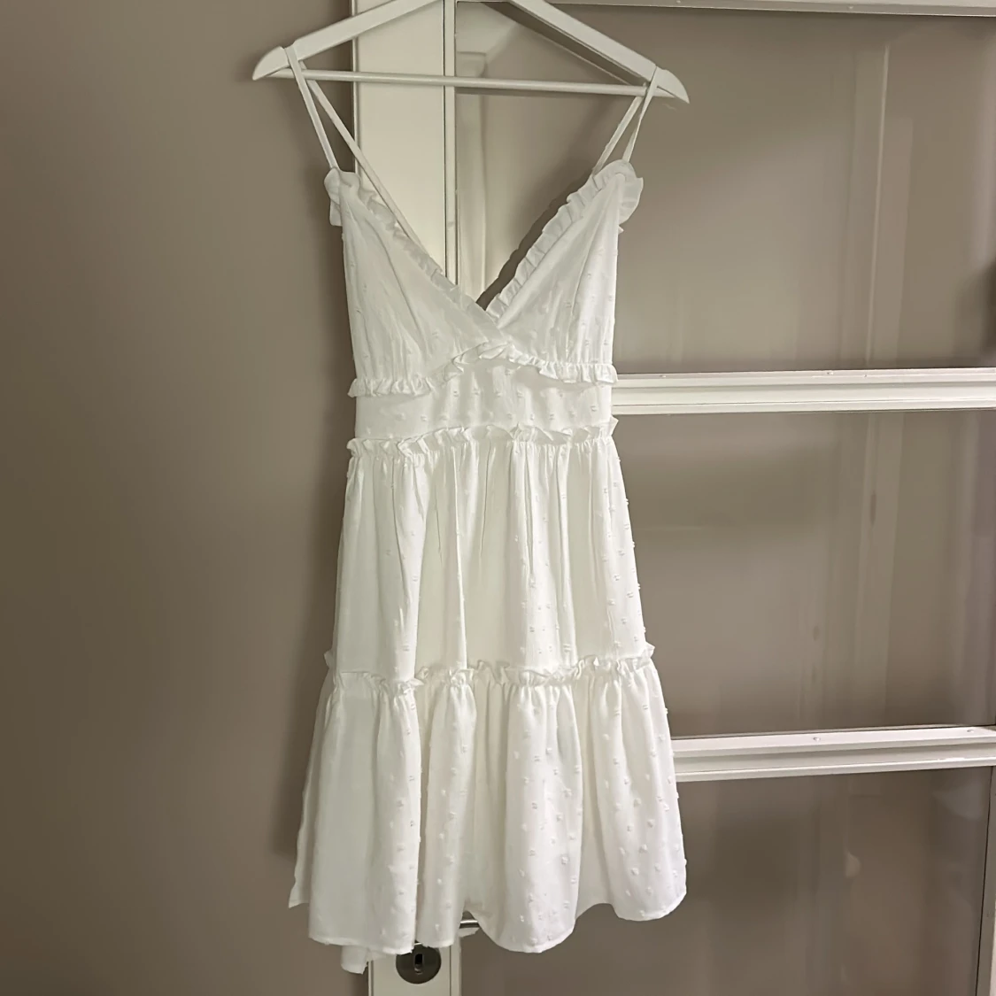 Superfin vit kortklänning med omlottliv, smala axelband och volangdetaljer. Klänningen har lätt struktur i tyget och är perfekt för sommarens alla tillfällen. Söt och luftig modell med markerad midja och volanger i flera lager. Korsade band och dragkedja i ryggen
