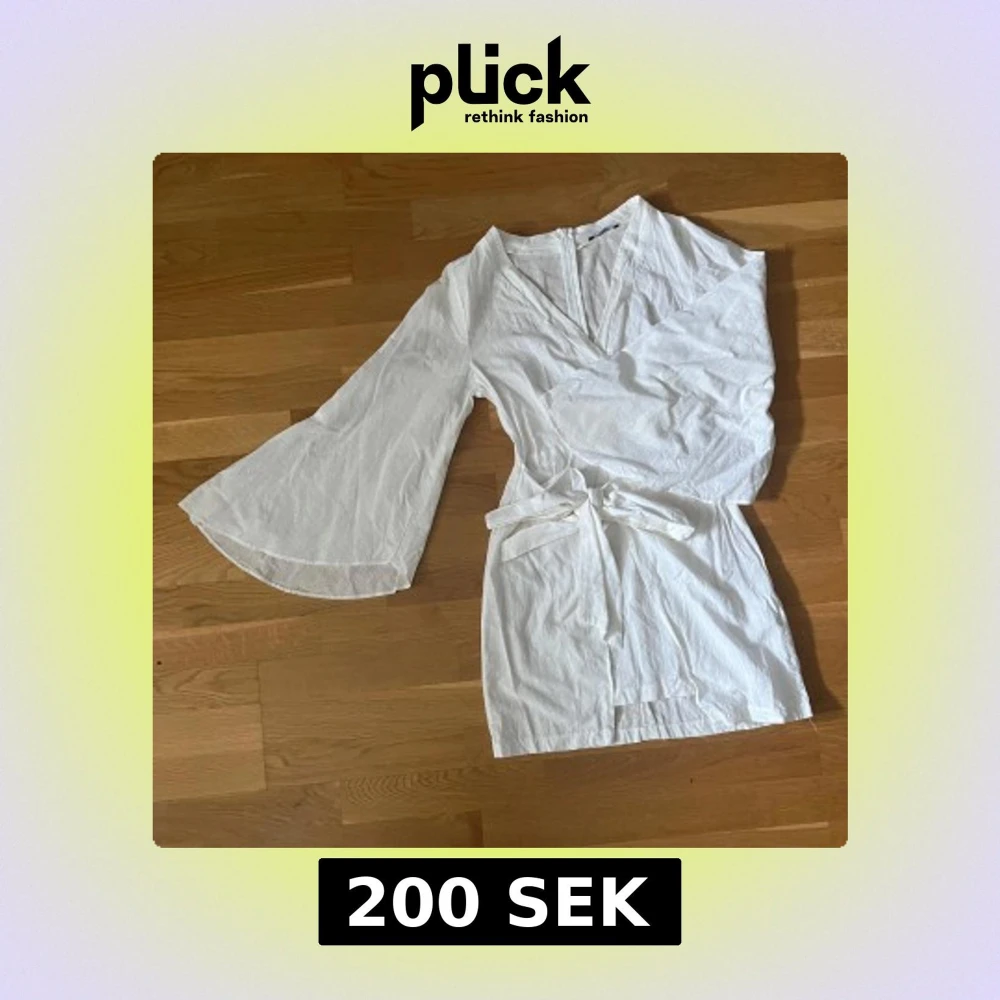 Säljer en fräsch vit kortklänning från Trendyol med omlott-design, v-ringning och vida långärmar. Klänningen har ett knytband i midjan och är gjord i ett lätt och luftigt linnematerial, perfekt för varma dagar. Ger Star Wars vibes, kan användas som kostym till Halloween exempelvis.