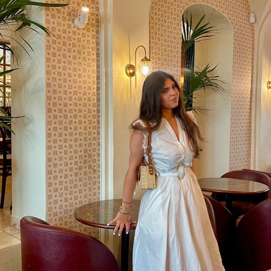Säljer en vit, ärmlös klänning med v-ringning och markerad midja med brett bälte och rund spänne. Klänningen har knappar framtill och ett luftigt, lätt utställt kjolparti som slutar strax under knäet. Perfekt för varma dagar och stilrena outfits.