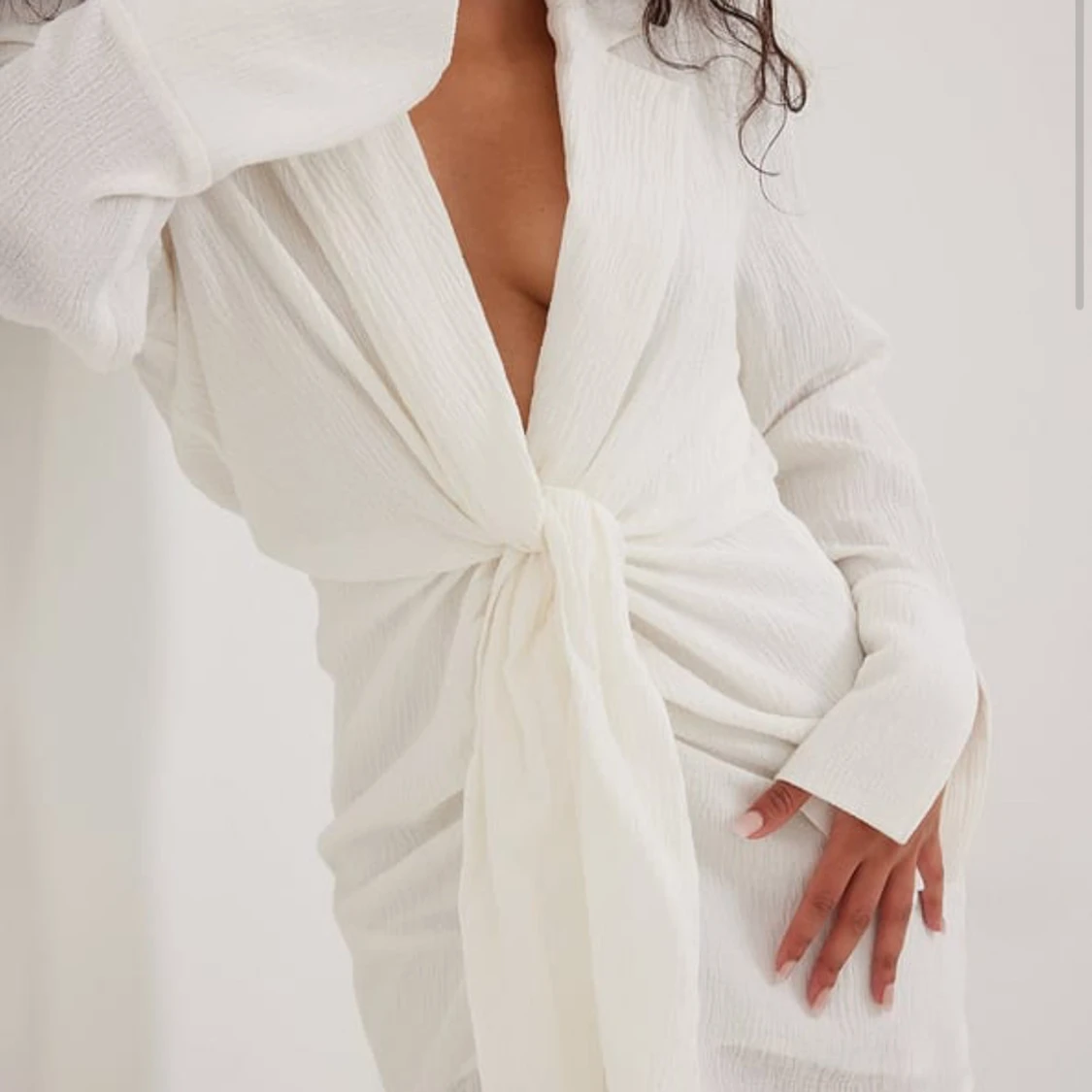 (1 bilden är lånad) Superfin vit klänning med omlott och knyt framtill. Djup v-ringning och långa ärmar, superfin klänning till sommaren. Skönt material, använd 2 gånger och är fortfarande i helt nytt skick. Helt slutsåld på hemsidan!!