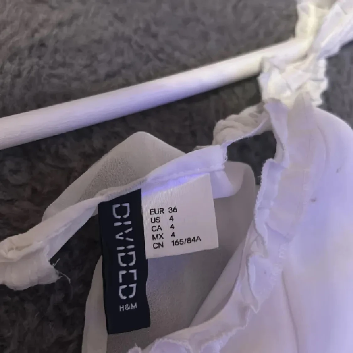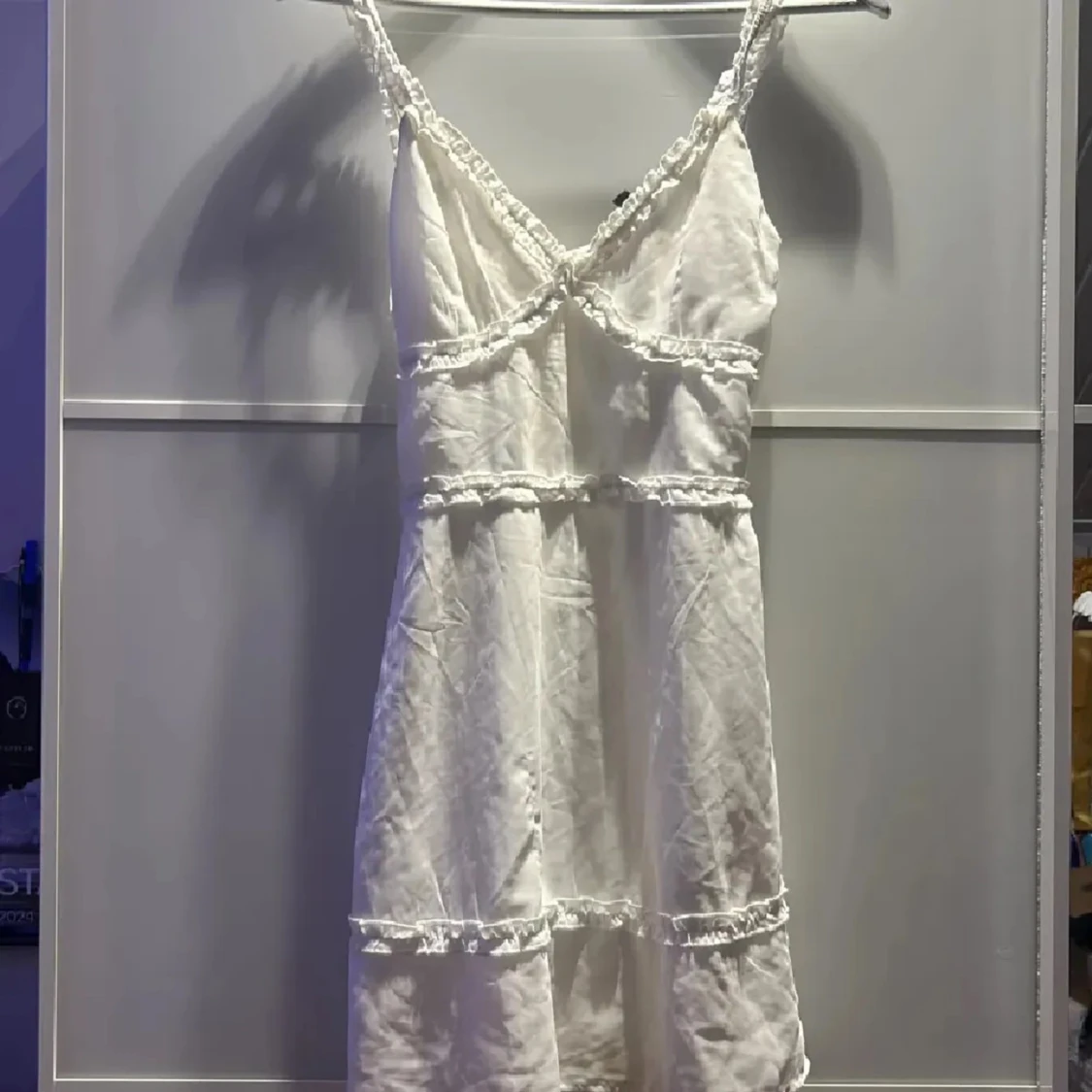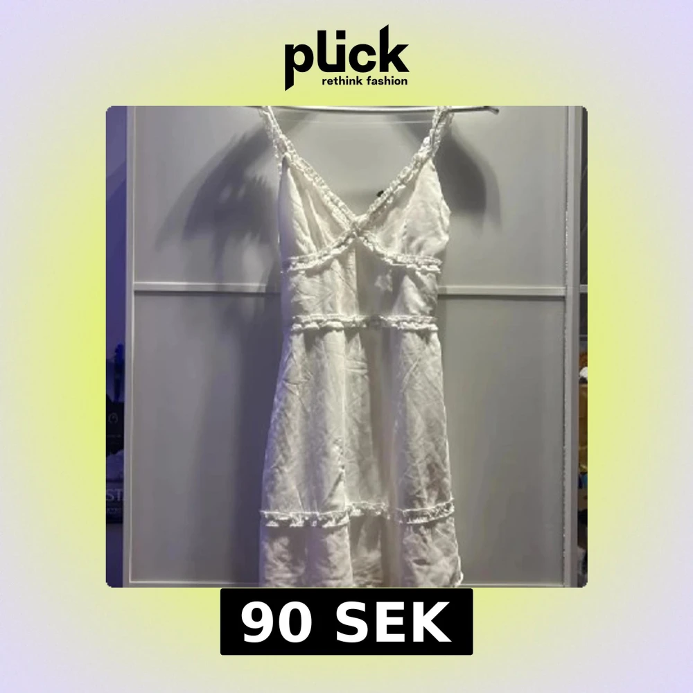 Söt vit kortklänning från H&M Divided med smala axelband och fina spetsdetaljer längs kanterna. Klänningen har omlottkänsla och volangdetaljer, perfekt för sommarens alla tillfällen.