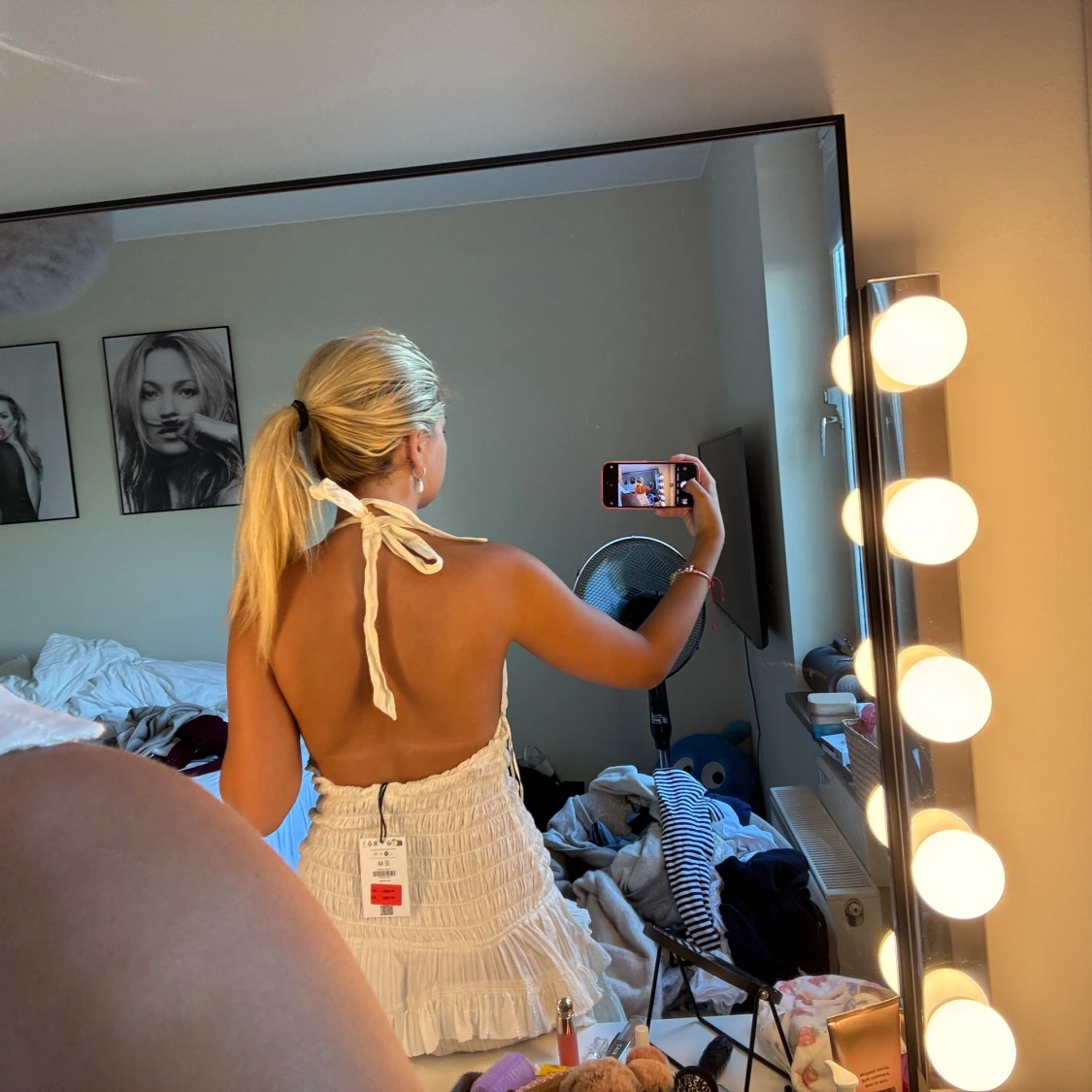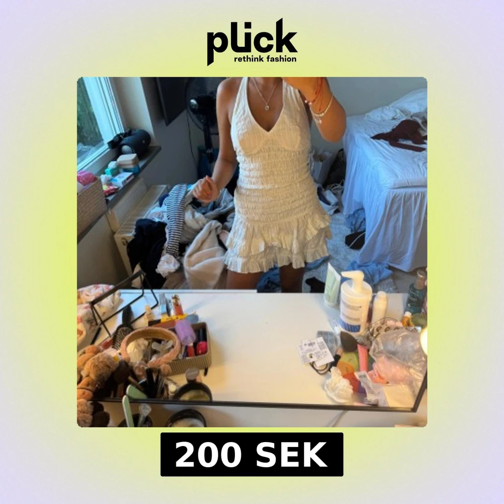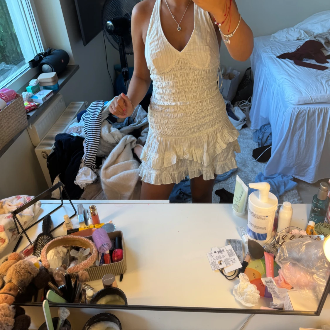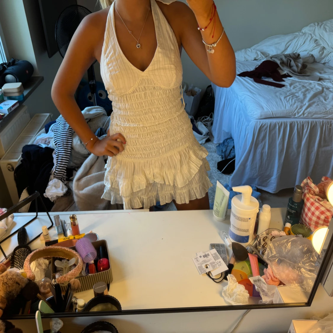 Supersöt kort vit klänning med omlottknytning i nacken, öppen rygg och volangkant nertill. Smockad överdel och kjol ger en snygg passform. Perfekt för sommarens alla tillfällen, lätt och luftig i bomull.