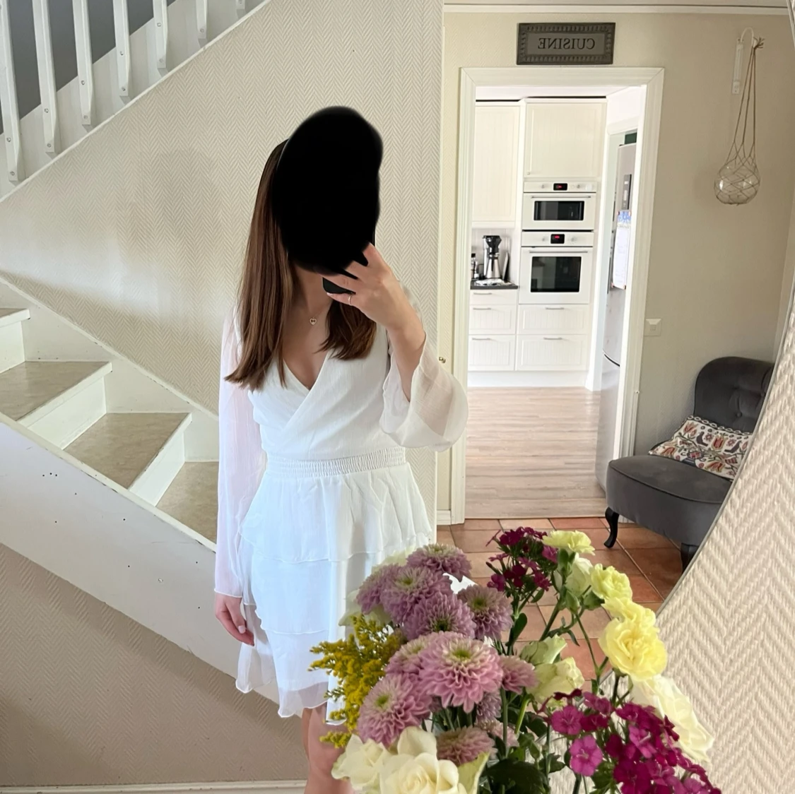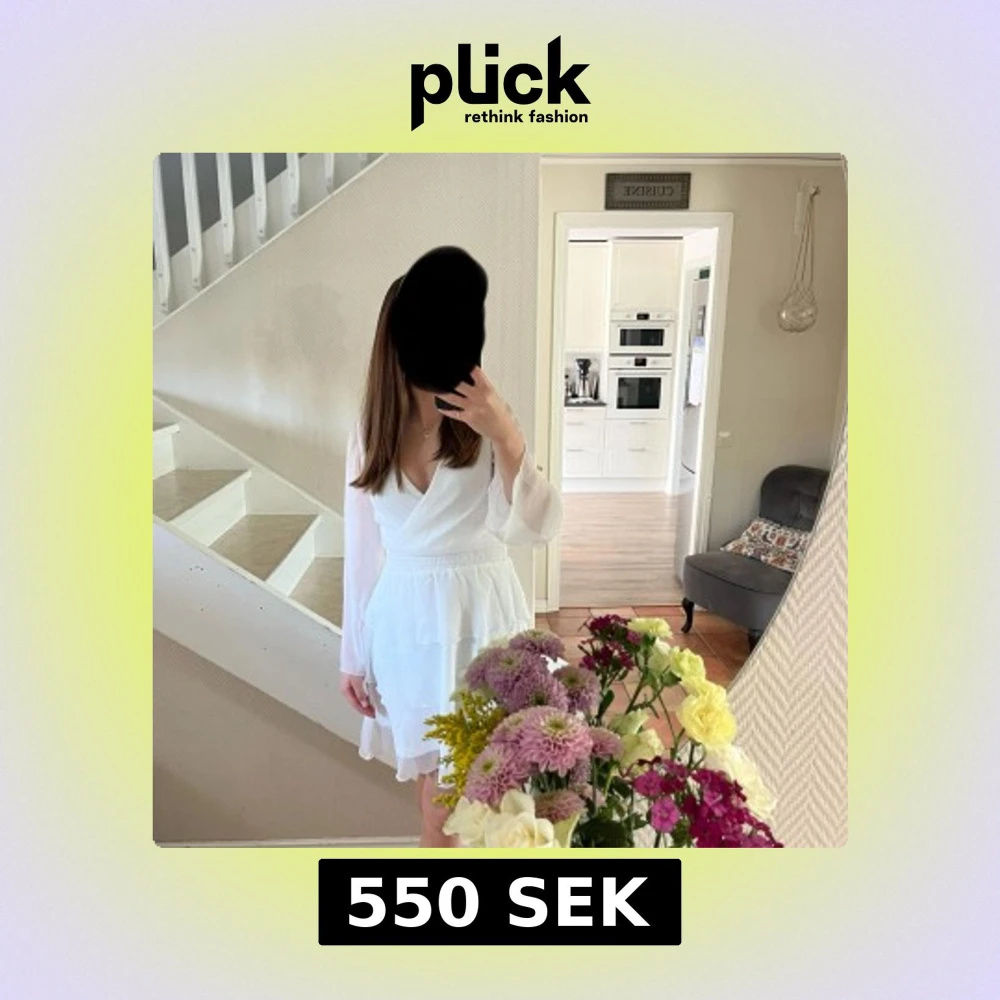 Säljer en superfin vit kort omlottklänning med v-ringning och långa, transparenta ärmar. Kjolen har volangdetaljer och resår i midjan för en bekväm passform. Perfekt för varma dagar och somriga tillfällen! Använd en gång.