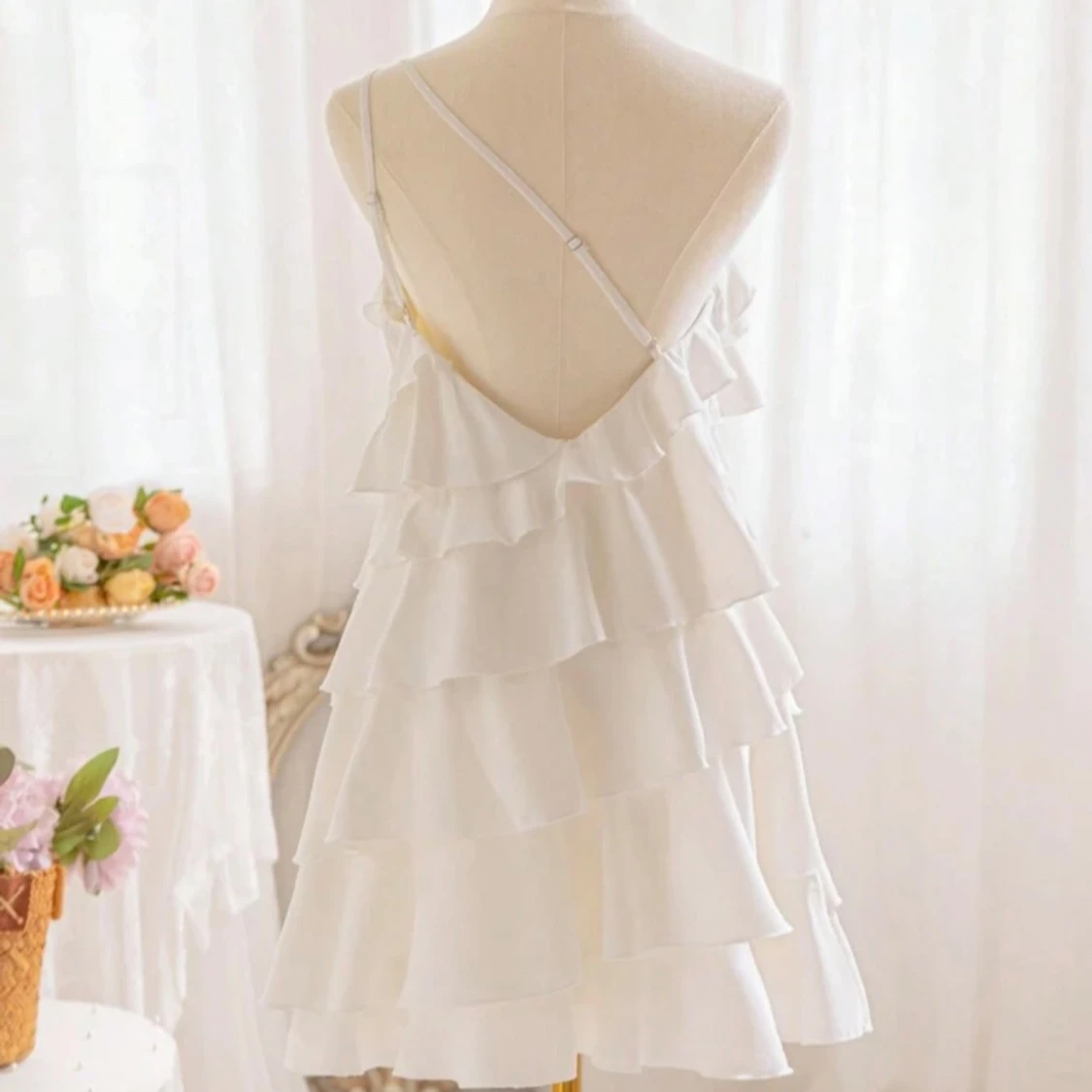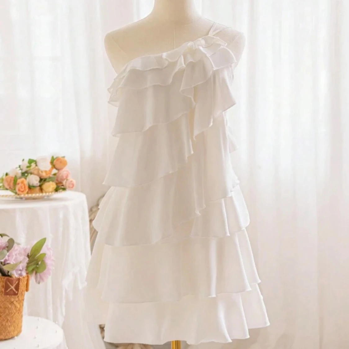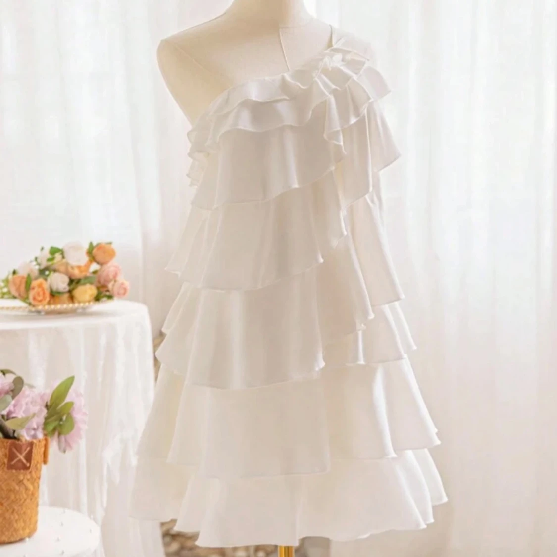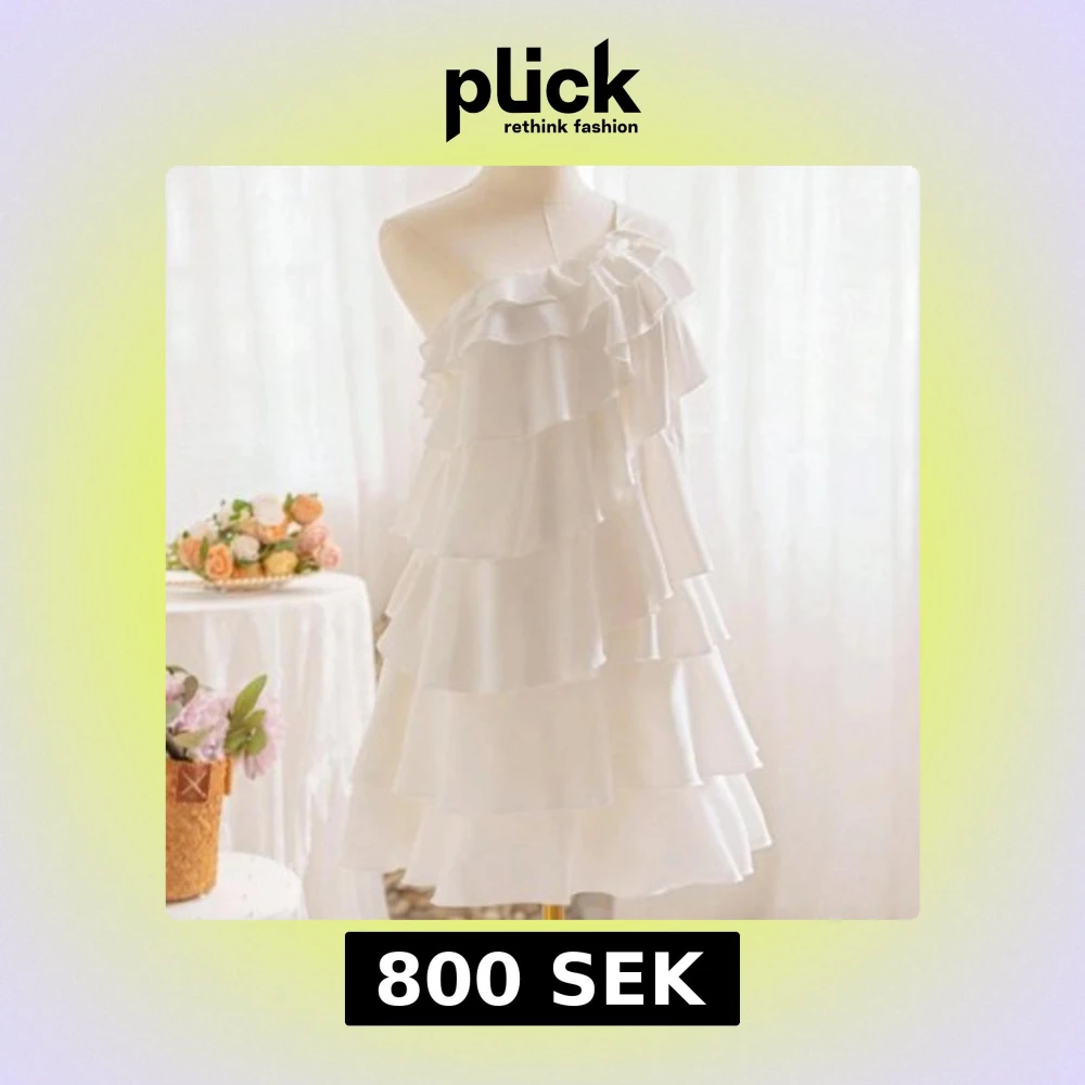 Jättefin studentklänning!!!💗Supersöt vit kortklänning volanger och asymmetrisk axelbandslös design. Klänningen har en omlott-look med ett axelband och passar allt mellan xxs-m, den är väldigt stretchig! Skriv vid frågor💗