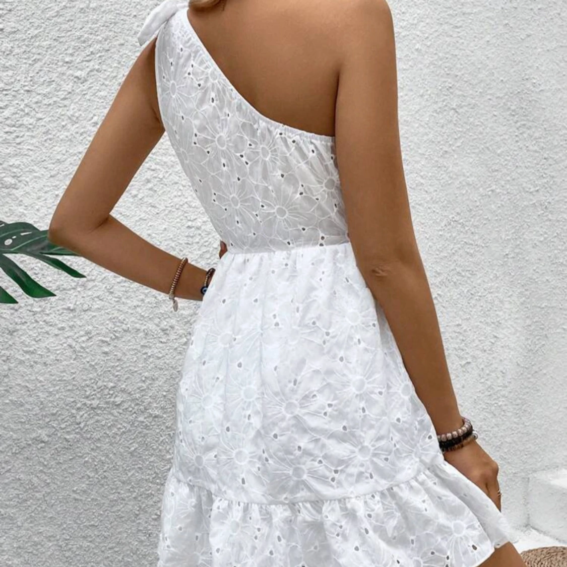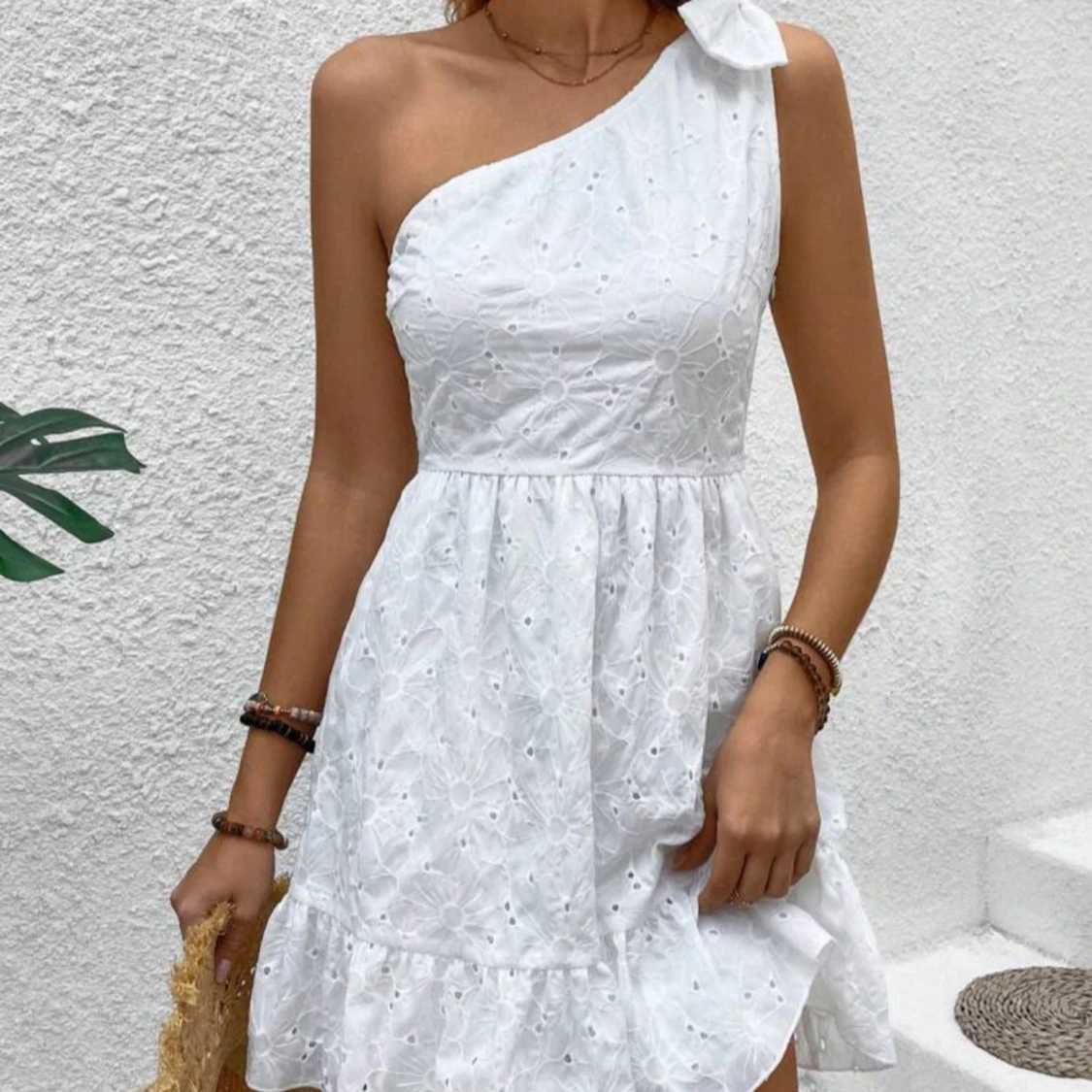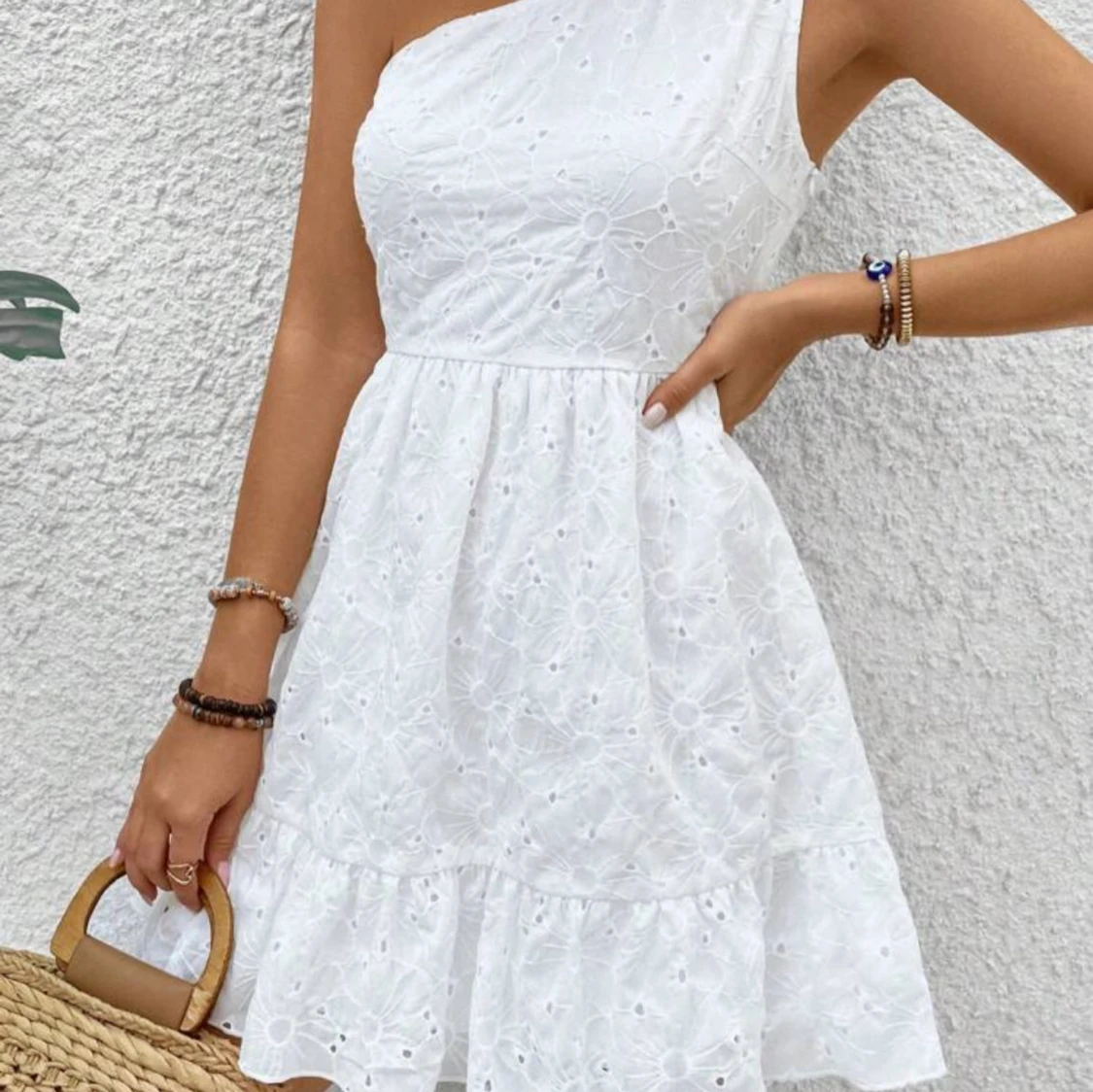 Snygg vit oneshoulder klänning med broderade detaljer och volangkant. Perfekt för sommarens alla tillfällen och student! Klänningen har en söt rosett på axeln!