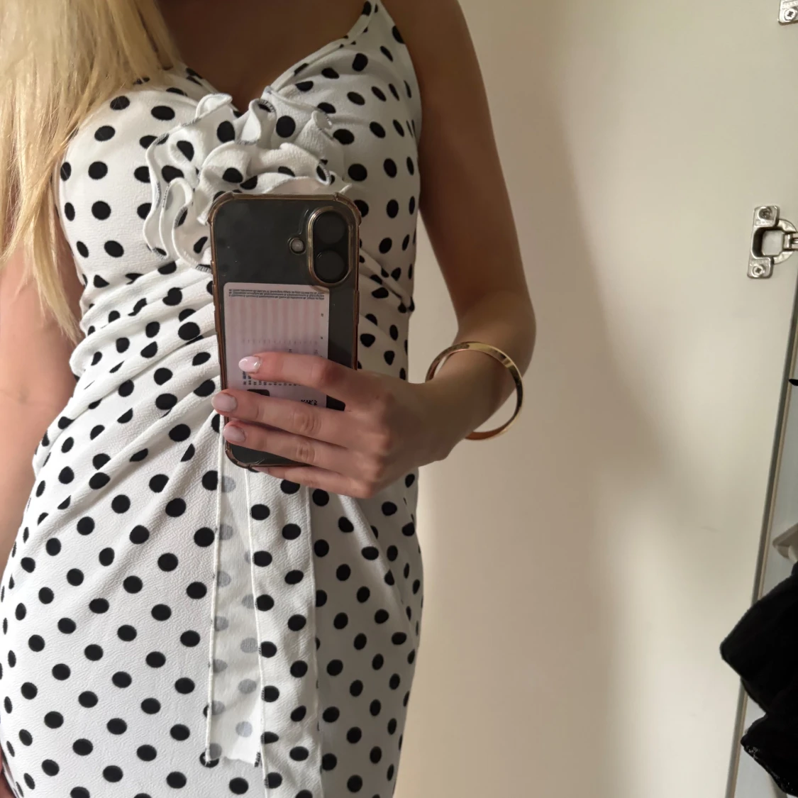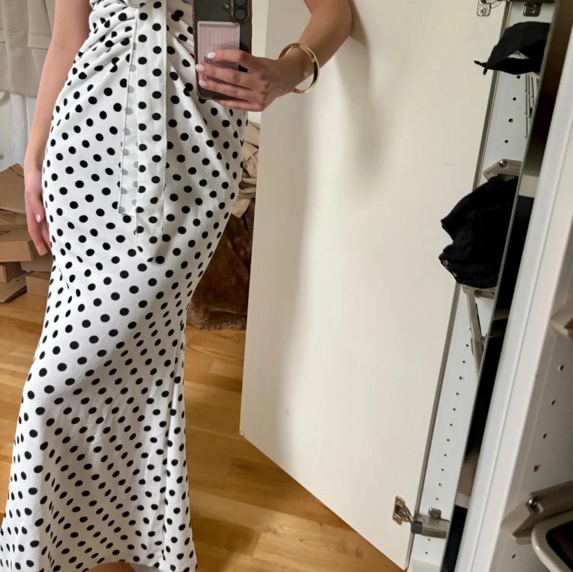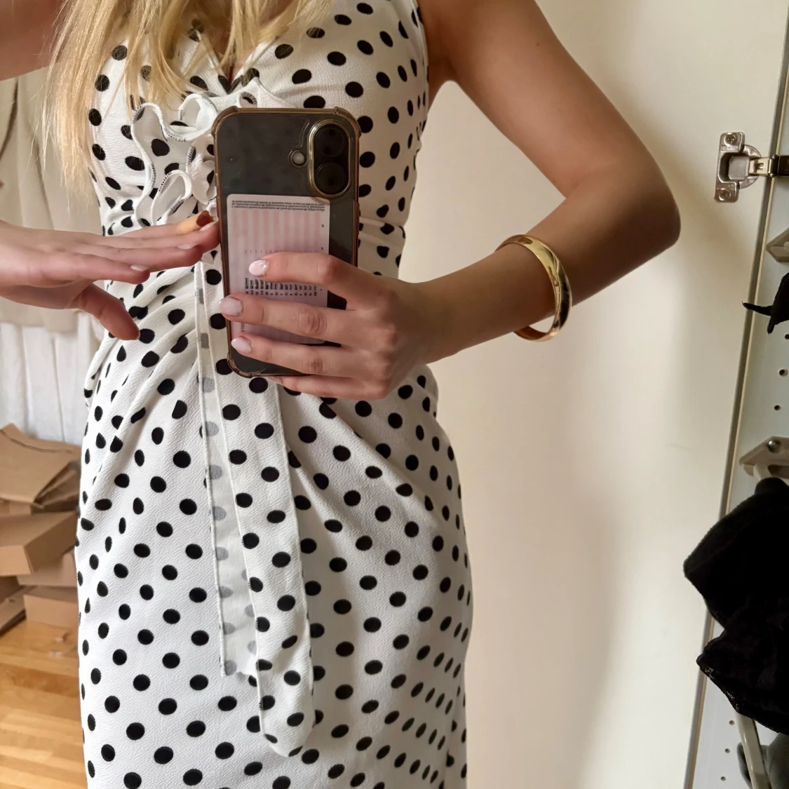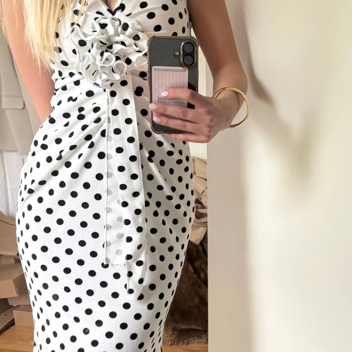 Supersnygg långklänning i vit med svarta prickar från prettylittlething i storlek xs