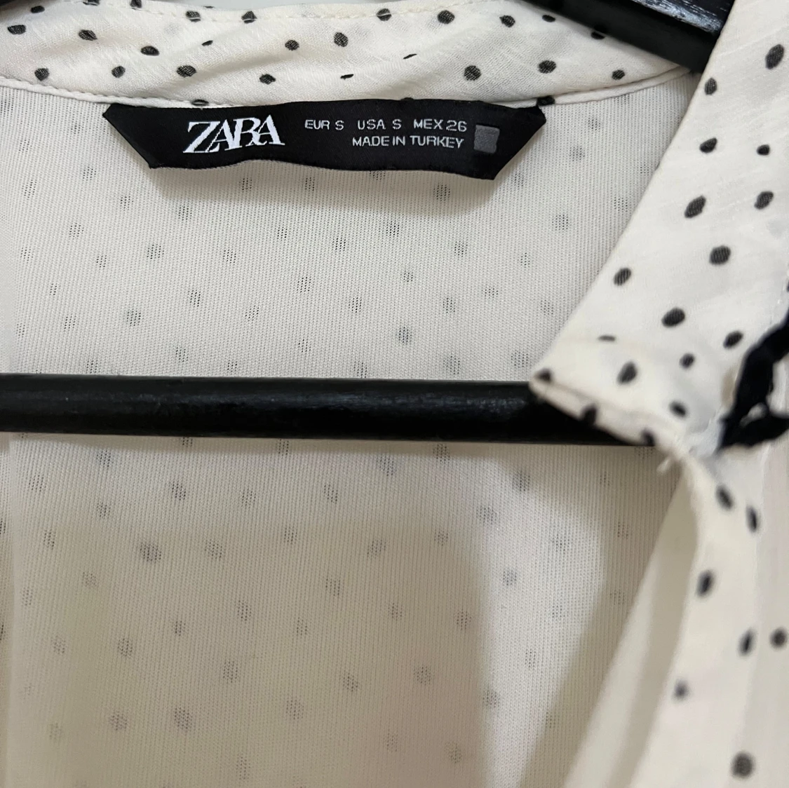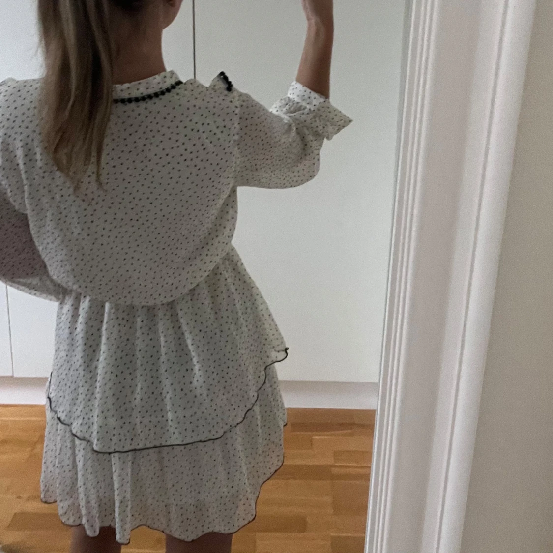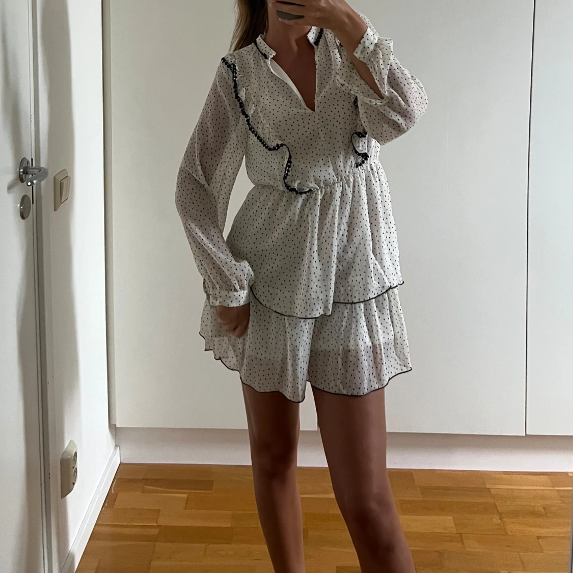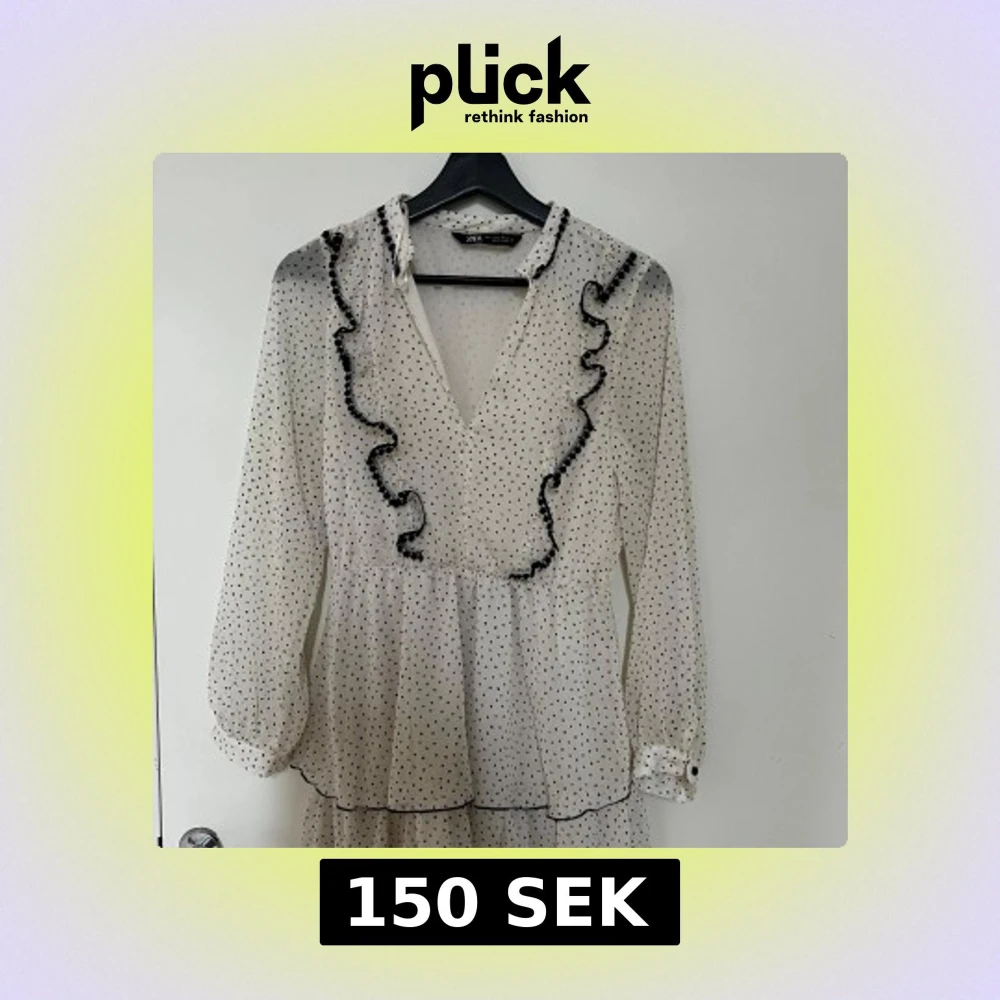 Supersöt kort volangklänning från Zara i vitt med svarta prickar. Klänningen har långa ärmar, v-ringning och fina volangdetaljer framtill. Tunt, luftigt material och markerad midja ger en flowy känsla. Perfekt för dig som gillar trenden med prickigt.