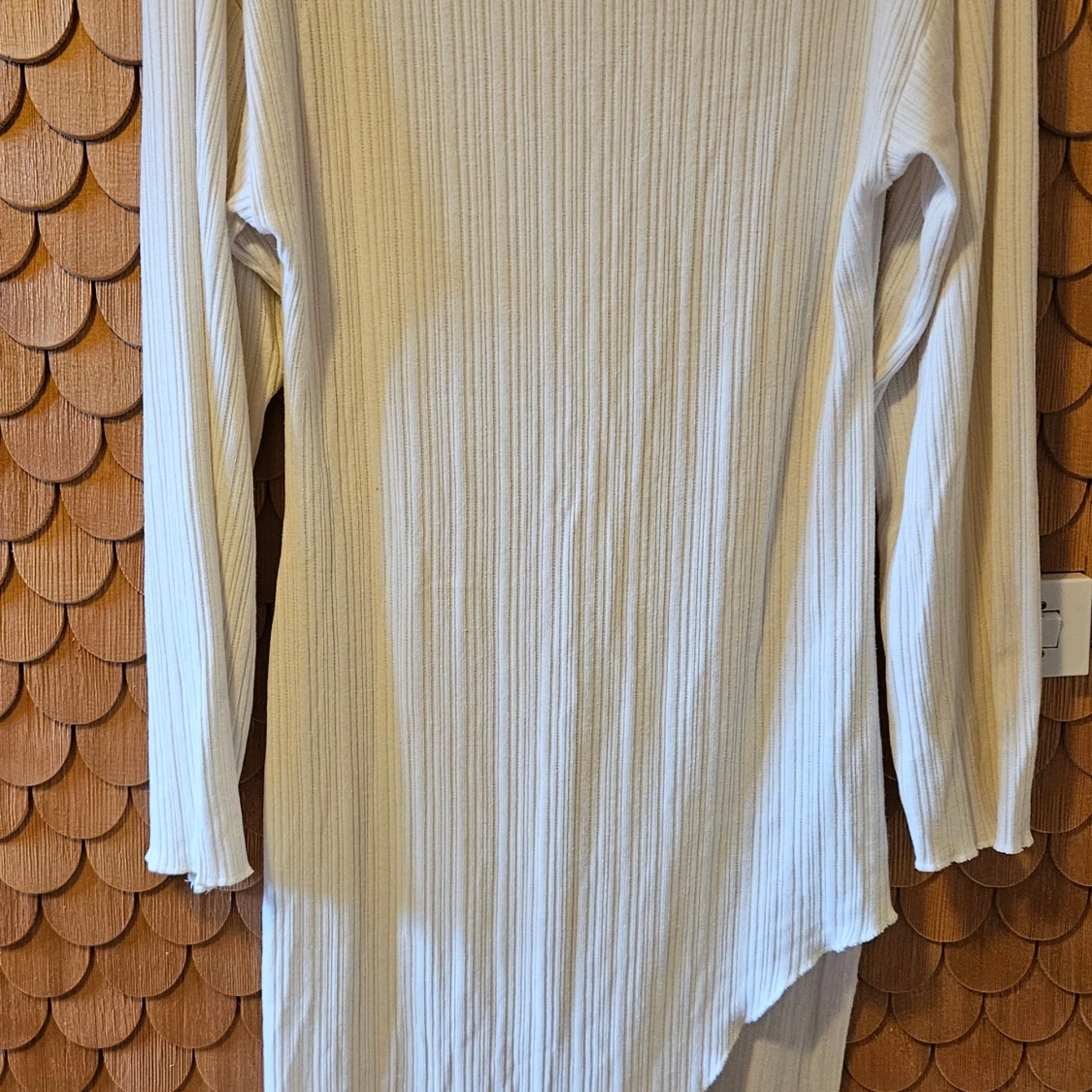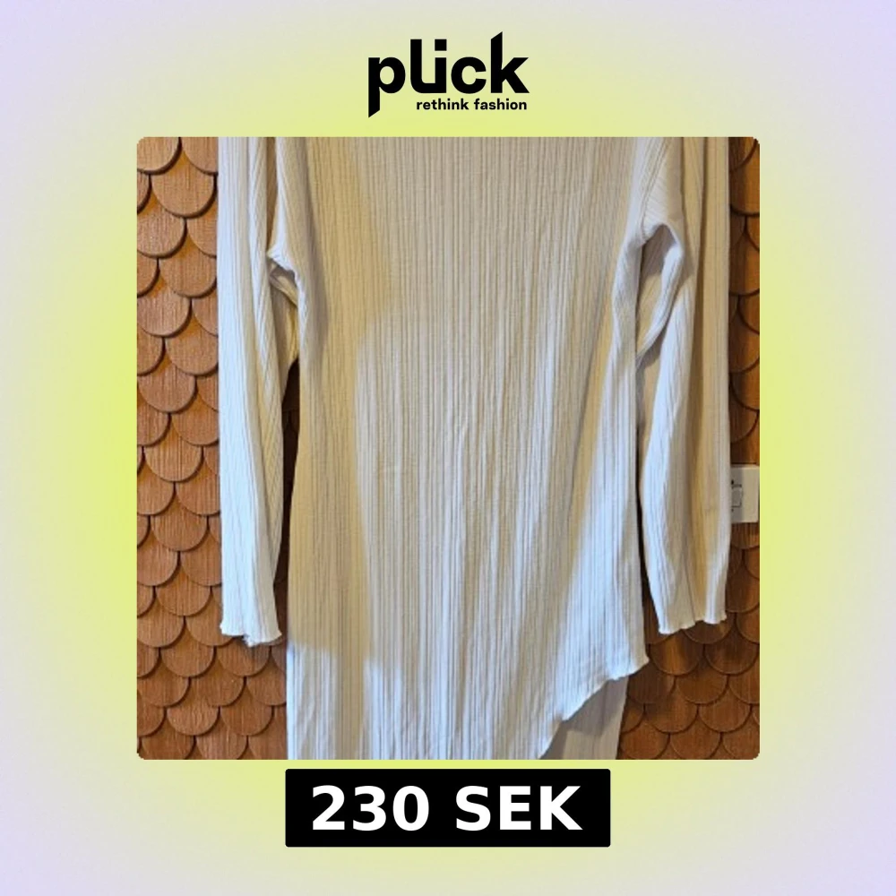 Vit ribbad klänning från H&M i storlek L. Klänningen har lång ärm, rak passform och är tillverkad i ett mjukt, stretchigt material. Fin sne slits. Inte jätte genomskinlig men man kan se ytte pytte igenom