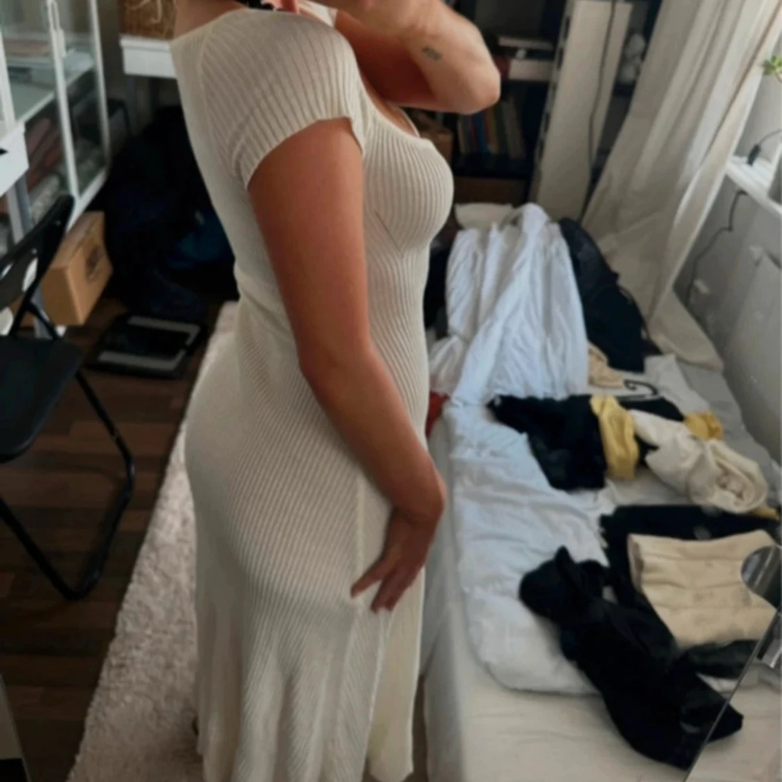 Supersnygg vit ribbad långklänning med v-ringad hals och korta ärmar. Klänningen har en figurnära passform upptill och faller snyggt nedåt. Perfekt för dig som gillar en stilren och fräsch look med lite extra edge.