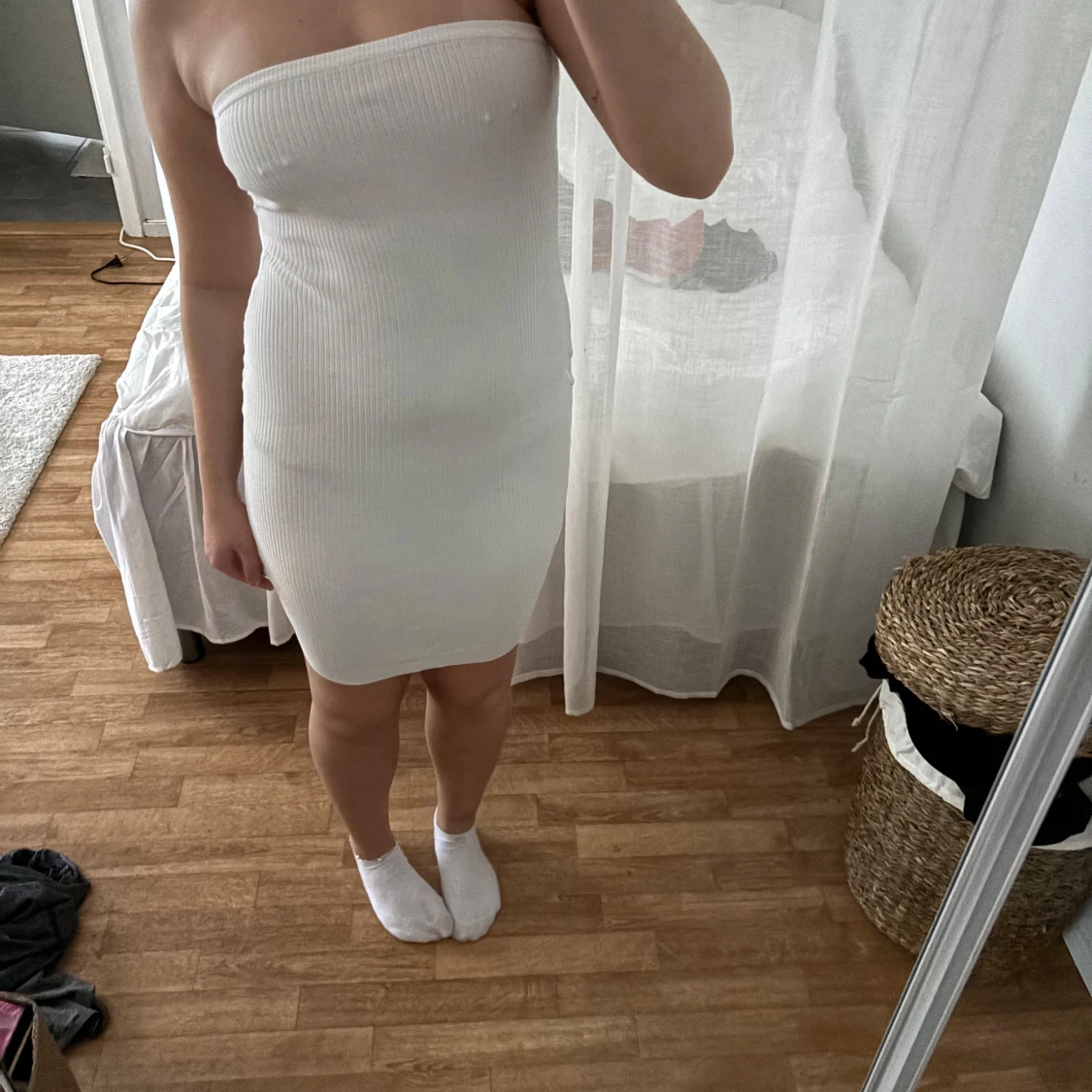 Säljer en vit, ribbad tubklänning i stretchigt material. Klänningen är kort och sitter tight mot kroppen, perfekt för dig som gillar en enkel men snygg look. Ärmlös och axelbandslös design som ger en clean och modern vibe.
