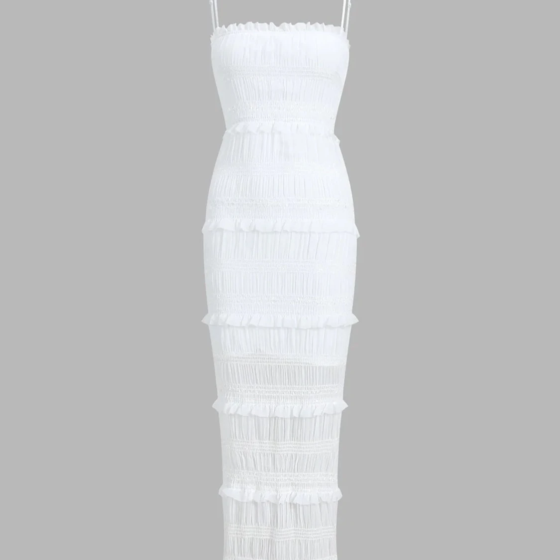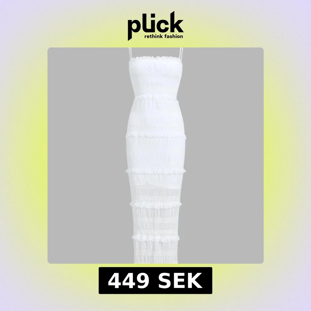 Säljer en elegant vit klänning med smala axelband och volangdetaljer. Klänningen har en tight passform och är perfekt för sommarens festligheter. Klänningen är inte beige som det ser ut på andra bilden utan ser ut som första.