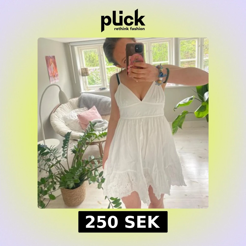 Söt vit klänning med v-ringning och smala axelband. Klänningen har broderade detaljer nertill och en luftig, lätt kjol. Perfekt för sommaren!!!