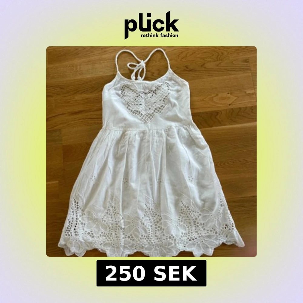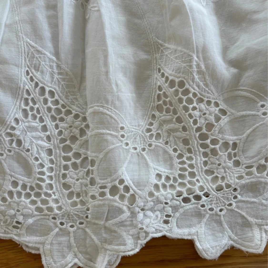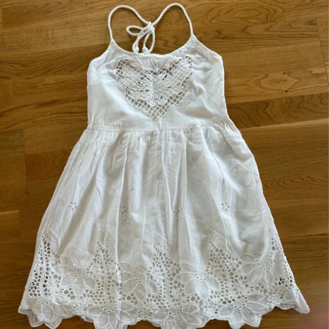 Superfin vit kortklänning med tunna axelband och knyt i nacken. Klänningen har broderade blommor och spetsdetaljer både upptill och längs fållen. Perfekt för varma dagar och har en luftig känsla tack vare bomullsmaterialet.
