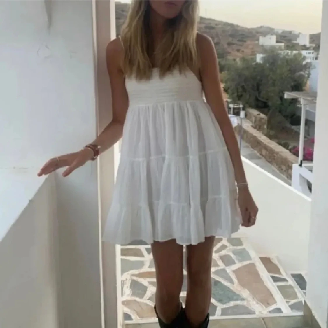 Superfin vit kortklänning med volang och ärmlös design. Klänningen har en luftig passform och smockad överdel.