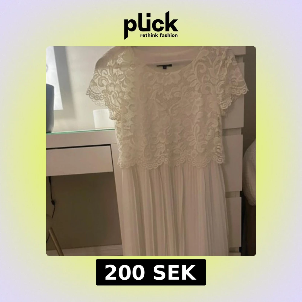 Säljer en vacker vit klänning med spetsöverdel och korta ärmar. Kjolen är plisserad och ger en elegant look. Perfekt för sommarens festligheter eller en speciell dag. 💫