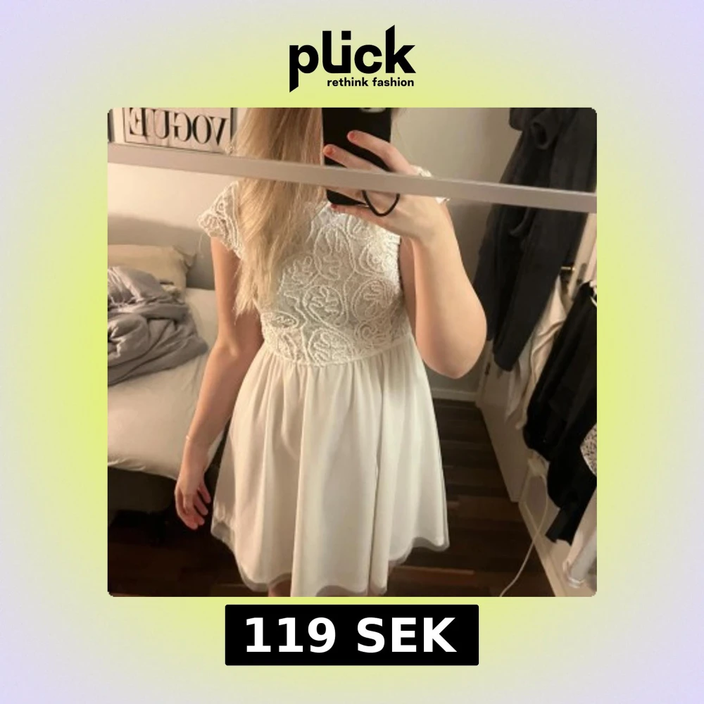 Säljer en söt vit klänning med spetsdetaljer på överdelen och en flödande kjol. Klänningen har korta ärmar och en rund halsringning. Perfekt för sommarens alla tillfällen! 🌸
