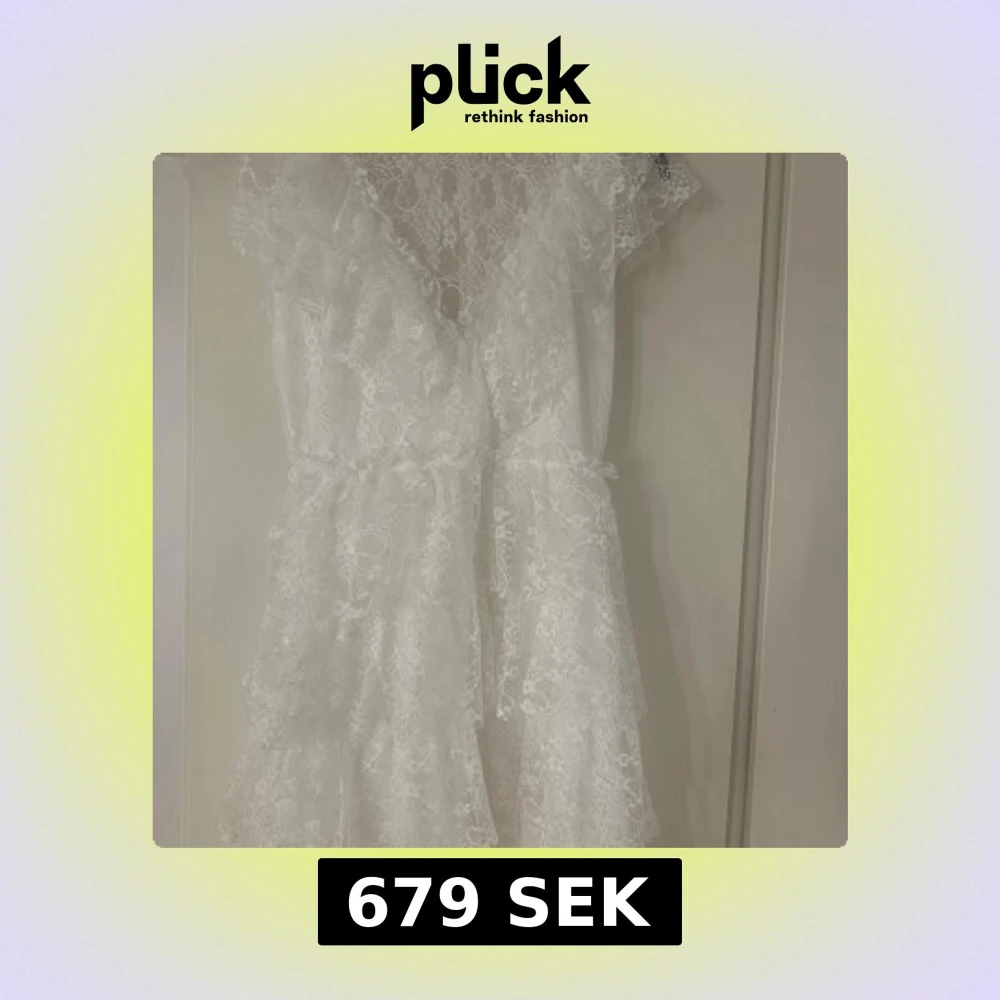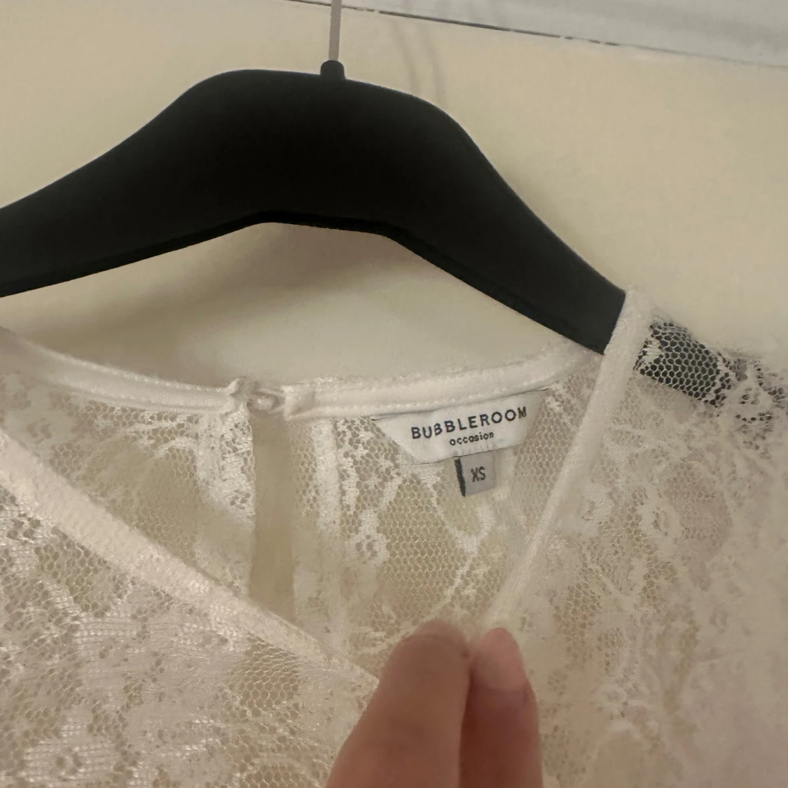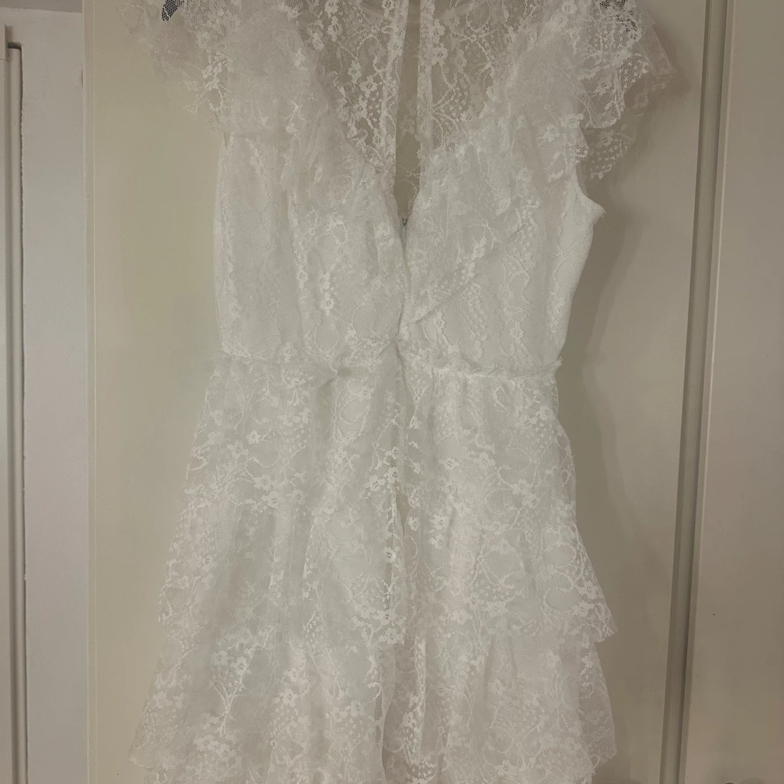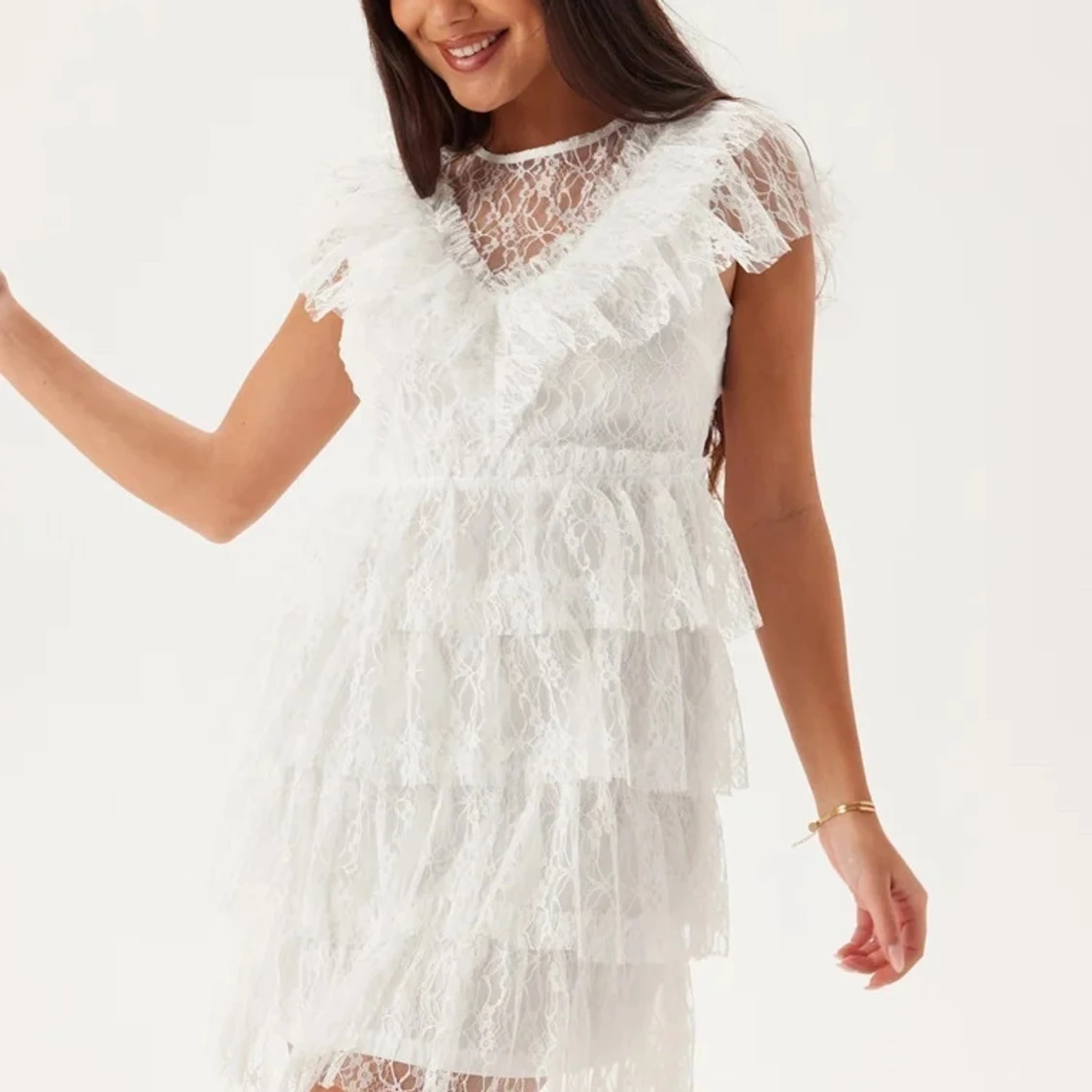 Superfin vit kort spetsklänning från Bubbleroom med volanger och v-ringning. Klänningen har genomgående spets, volangdetaljer och är ärmlös med en romantisk vibe. Perfekt för sommarens alla tillfällen när du vill känna dig extra söt eller till studenten.