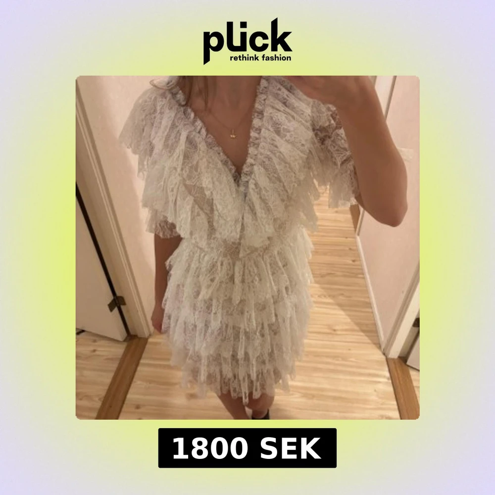 Superfin vit spetsklänning från By Malina med volanger och v-ringning. Klänningen har kort längd, genombruten spets och flera lager volanger som ger en romantisk vibe. Perfekt för studenten