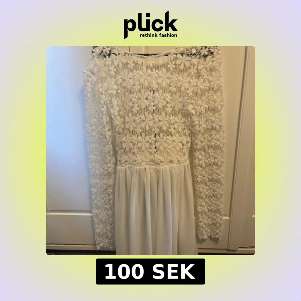 Superfin vit klänning från DM Retro med långärmade spetsärmar och blommigt spetsmönster upptill. Kjolen är slät och faller snyggt. Perfekt för dig som gillar romantisk och feminin stil. Dragkedja i bak för enkel påklädning.