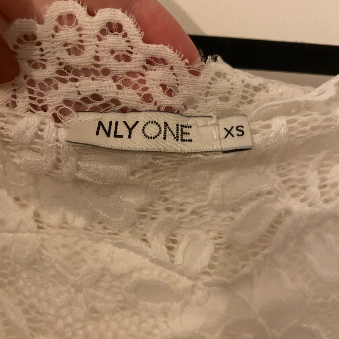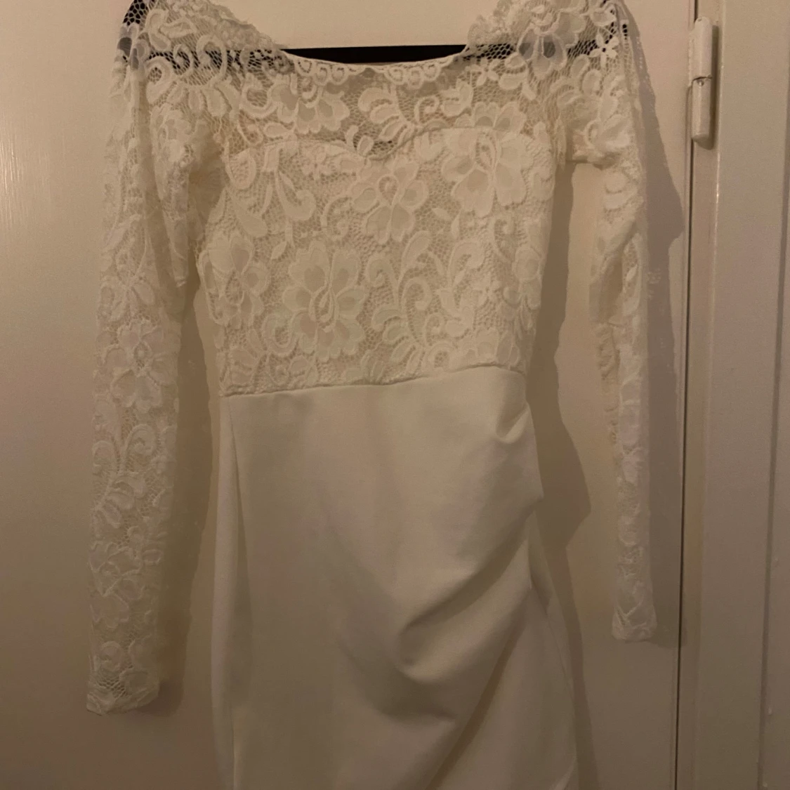 Säljer en superfin vit spetsklänning från Nelly i storlek XS. Klänningen är offshoulder med långa ärmar i spets. Endast använd en gång ❤️Första bilden är liknande klänningen som säljs, kjolen är alltså inte helt spets utan endast överdelen