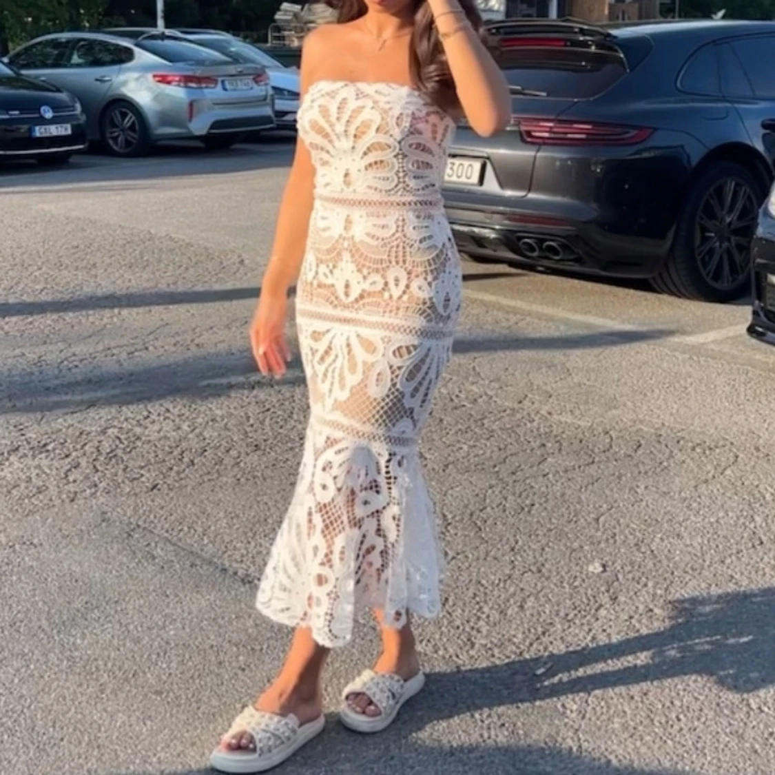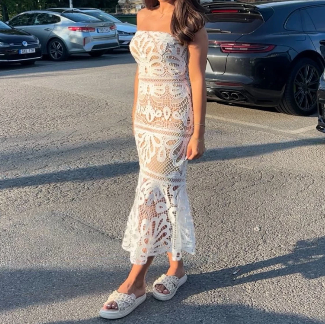 Säljer en superfin långklänning i vit spets med blommigt mönster. Klänningen är axelbandslös och har en figurnära passform med volangdetalj nedtill. Perfekt för sommarens alla tillfällen när du vill känna dig extra snygg och unik.