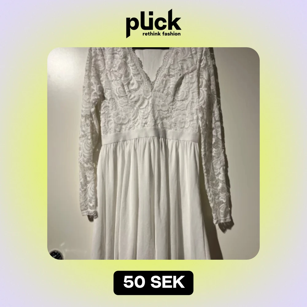 Säljer en superfin vit klänning med v-ringad spetsdetaljer på överdelen och långa ärmar. Kjolen är flödande och ger en elegant look. Perfekt för sommarens fester eller kanske till ett bröllop? 🎆