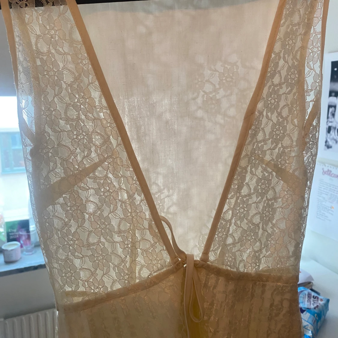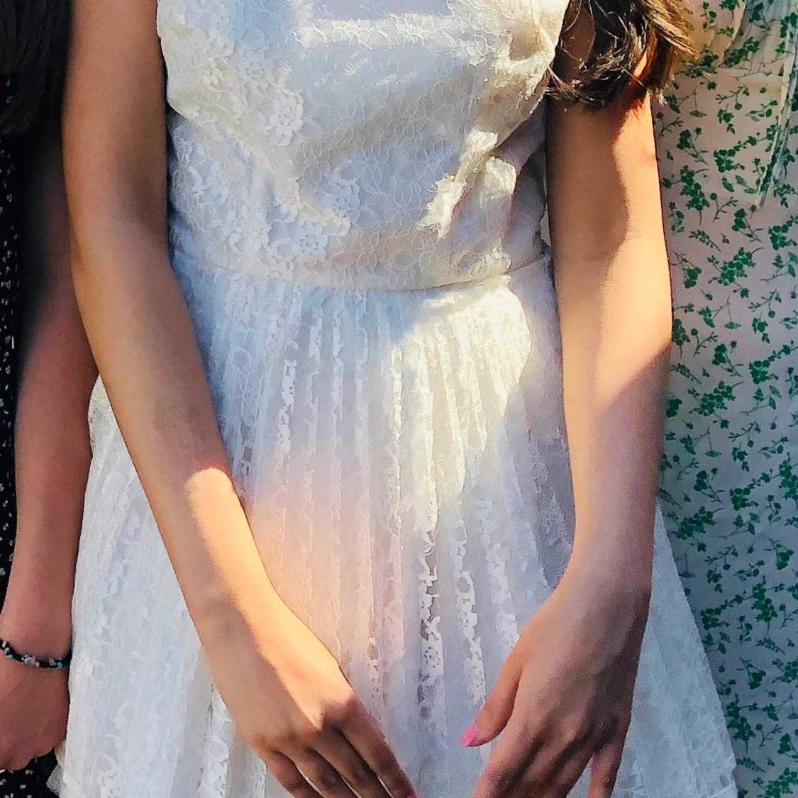 Superfin vit kortklänning i spets med blommigt mönster och plisserad kjol. Hög halsringning fram och djup v-ringad öppen rygg med knytband. Perfekt för sommarens speciella tillfällen. Använd endast en gång! Passar xs/small