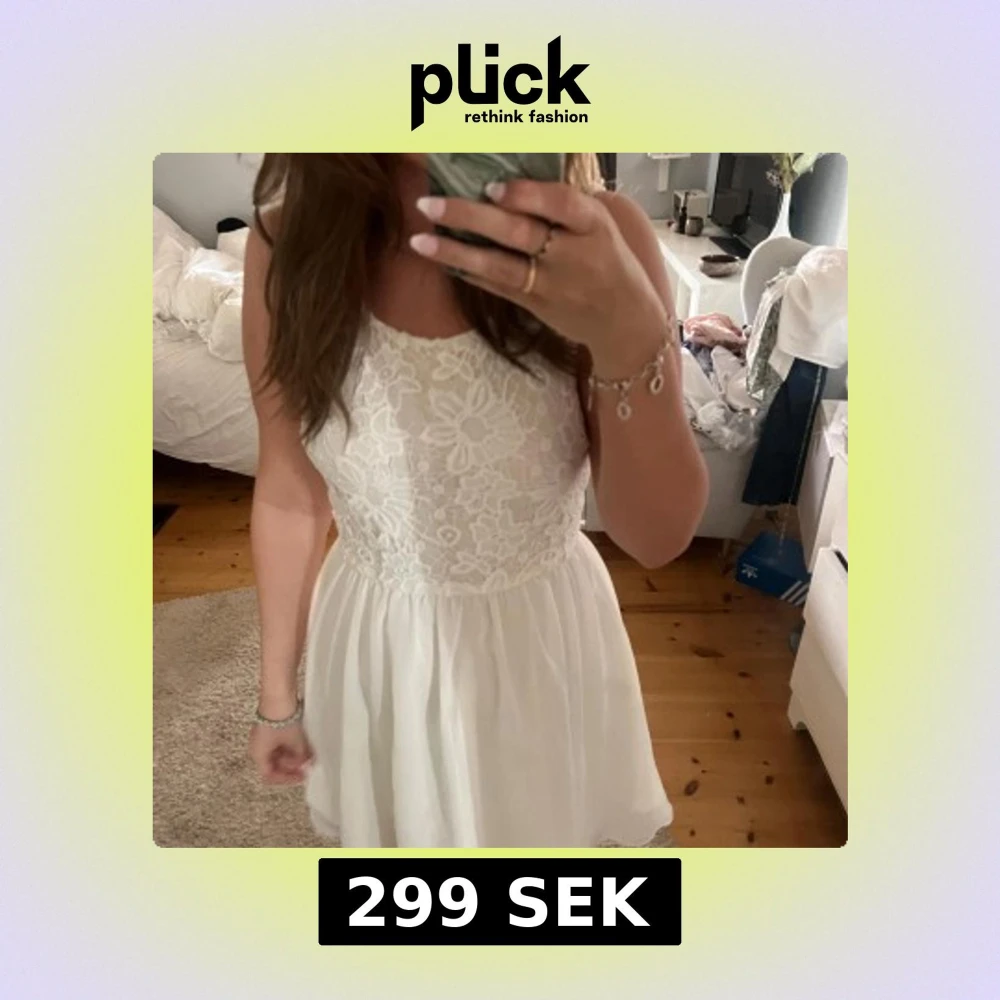 Säljer en söt vit klänning med spetsdetaljer och en vacker öppen rygg som knyts med en rosett. Perfekt för student och skolavslutningar