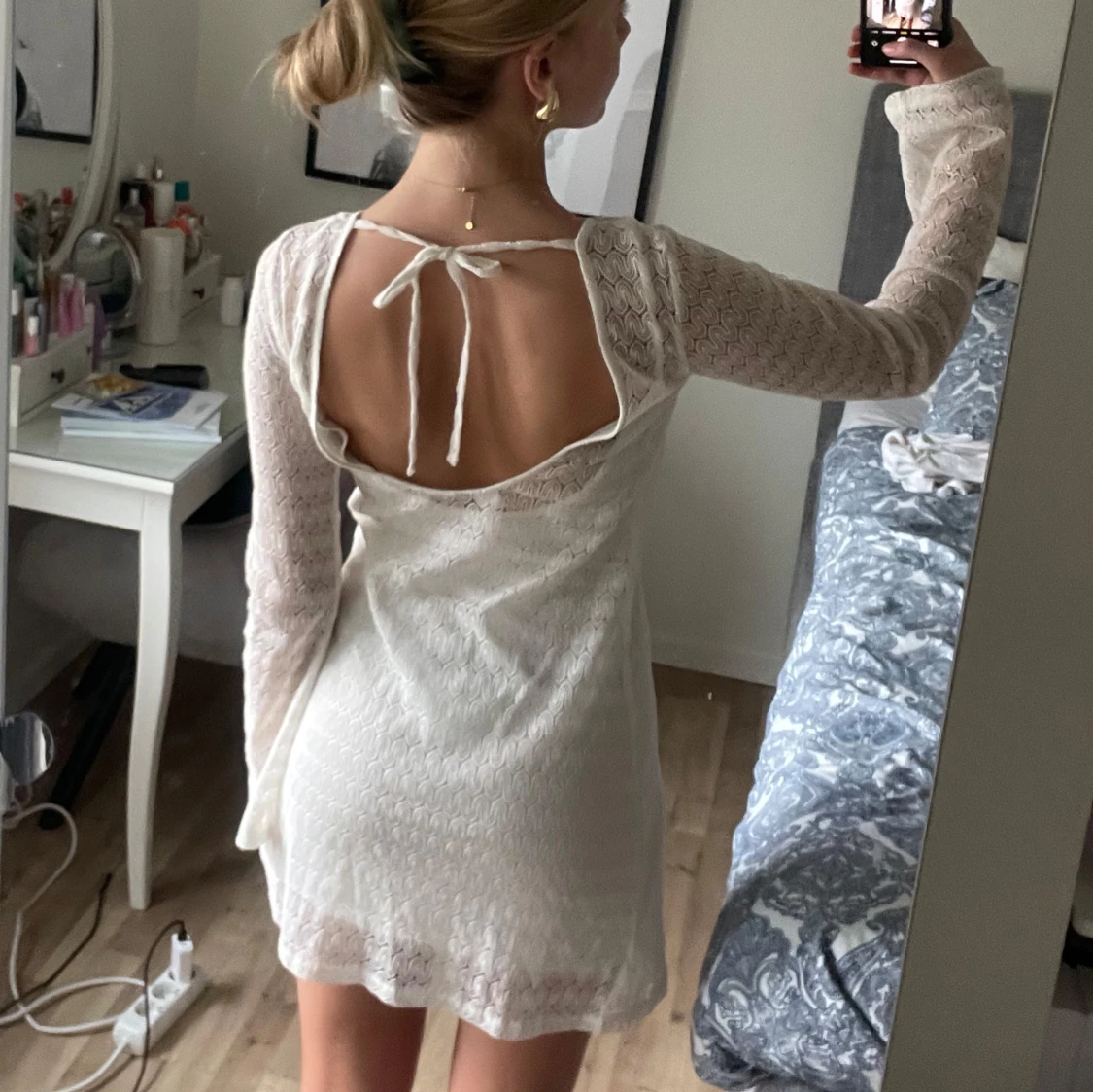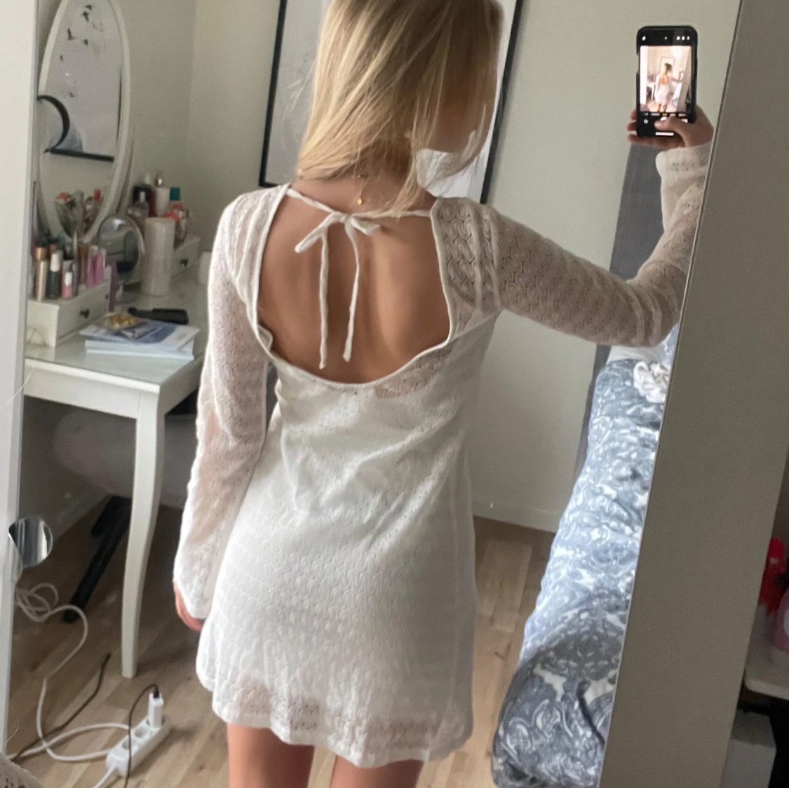 Säljer en söt vit kortklänning med långärmade spetsärmar och vacker öppen rygg med knytband. Klänningen har ett diskret vågigt mönster i spetsen och rund halsringning framtill. Perfekt för sommarens tillfällen och även studenten! ❤️Storleken är större än vad man tror, jag bär normalt sätt S men klänningen passar bra på mig!