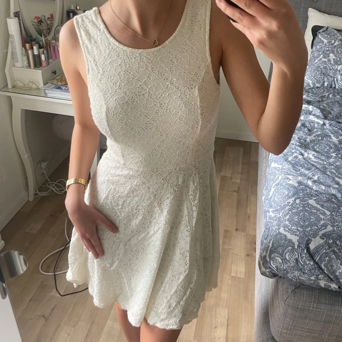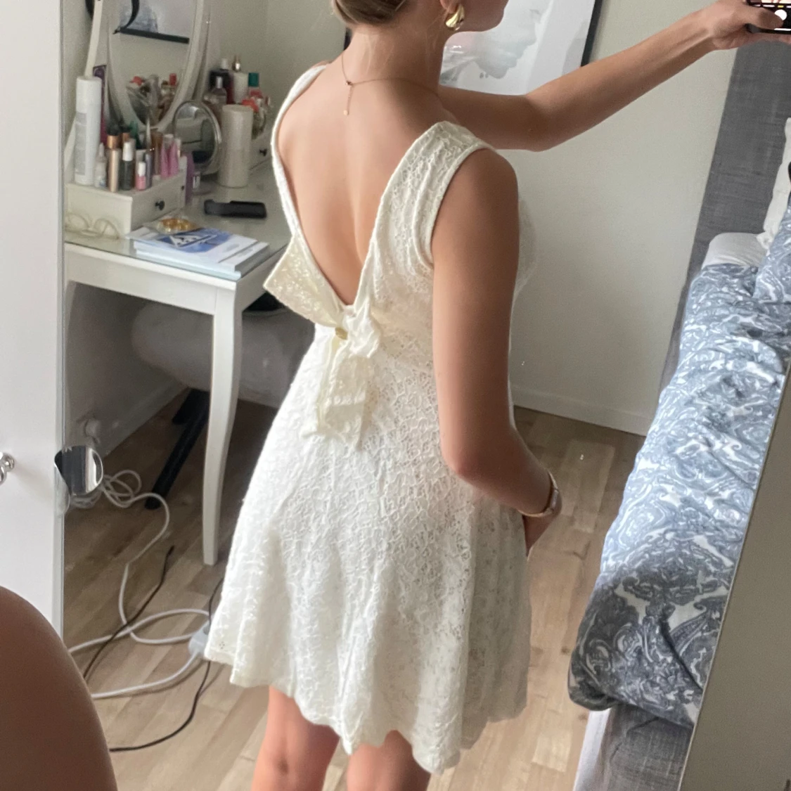 Säljer en söt vit spetsklänning med rund halsringning och öppen rygg. Klänningen har en rosett bak i midjan och är ärmlös med en lätt utställd kjol. Perfekt för sommarens tillfällen och även studenten! Pris kan diskuteras.