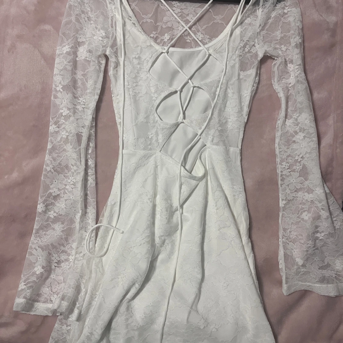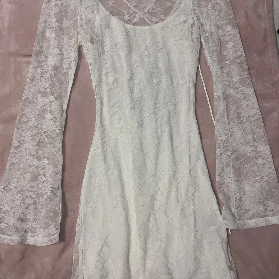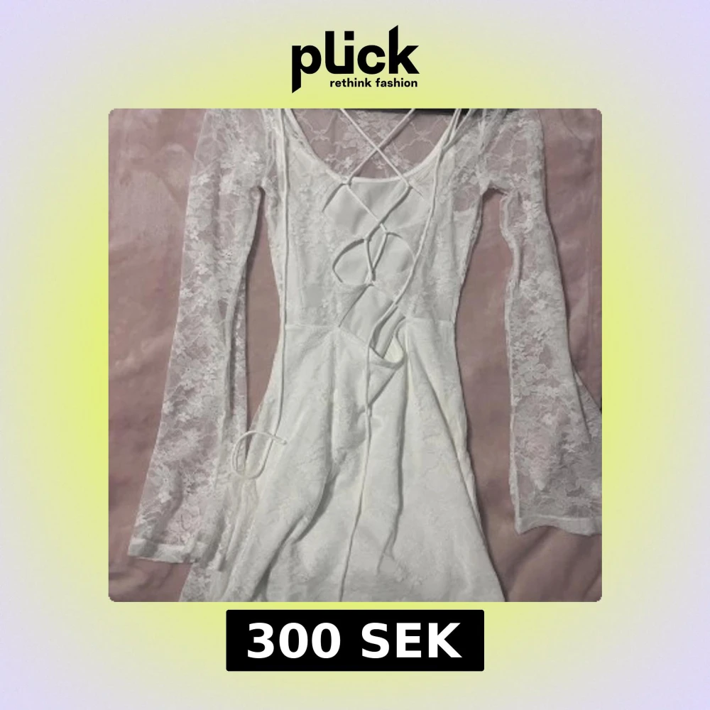 Superfin vit kortklänning i spets med långa ärmar och snygg snörning i ryggen. Klänningen har blommigt spetsmönster och är figurnära med lätt utsvängda ärmar. Perfekt för dig som vill sticka ut med en romantisk look. Har dock fått gärna fläckar på sig av en tuschpenna.