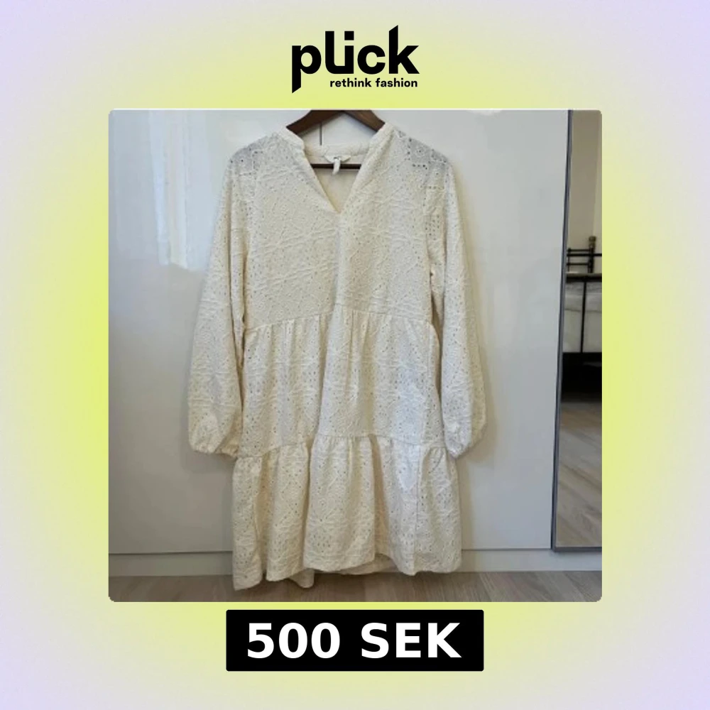 Söt vit klänning med v-ringning och långa ärmar. Klänningen har broderade spetsdetaljer och en luftig, volangig kjol. Perfekt för sommarens tillfällen och midsommarfirande.