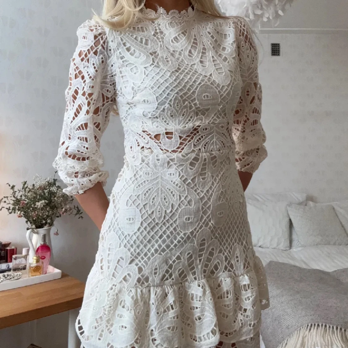 Superfin vit kort klänning i spets med vackra broderade detaljer och volang nertill. Perfekt till studenten!