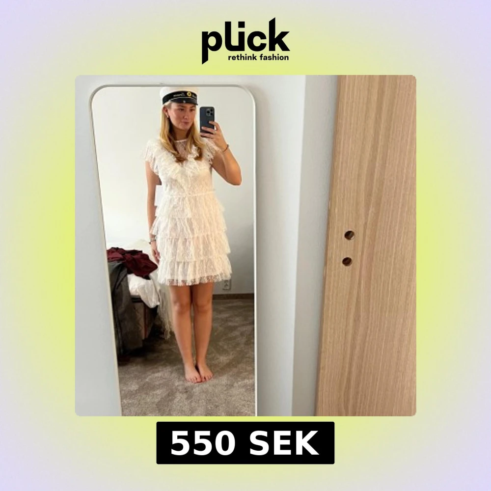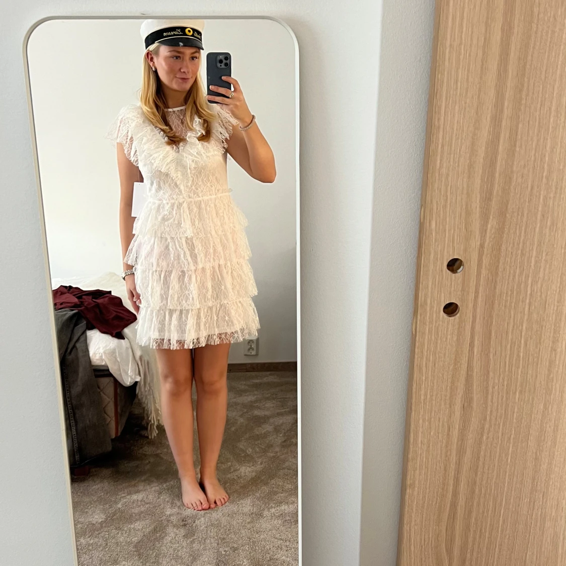 Säljer en av mina studentklänningar som enbart är använda några få timmar på förmiddagen av dagen! Superfin vit kort klänning med flera lager volanger och spetsdetaljer. Liknar ByMalina klänningen. Perfekt för student och annat festligt!