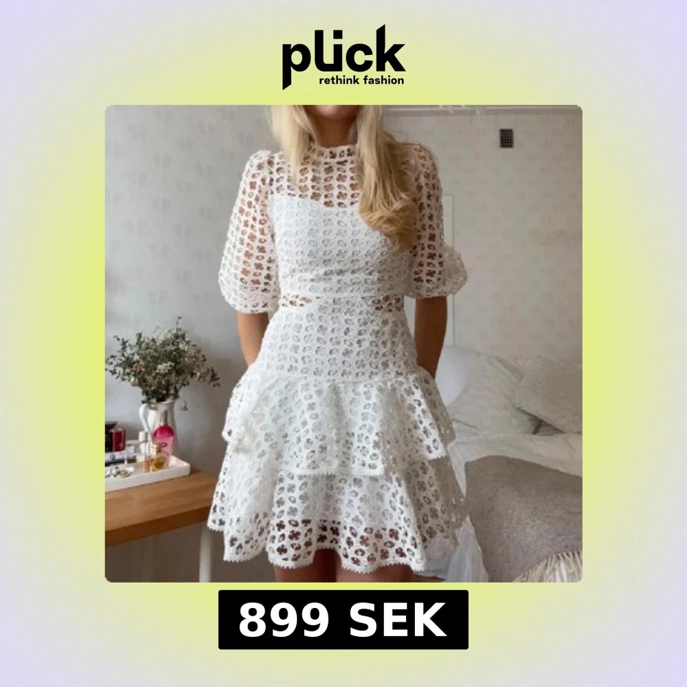 Superfin vit kortklänning med broderad spets och volanger. Klänningen har puffiga korta ärmar, hög hals och markerad midja. Detaljerad med genombrutet mönster och dubbla volanglager i kjolen för extra flärd.
