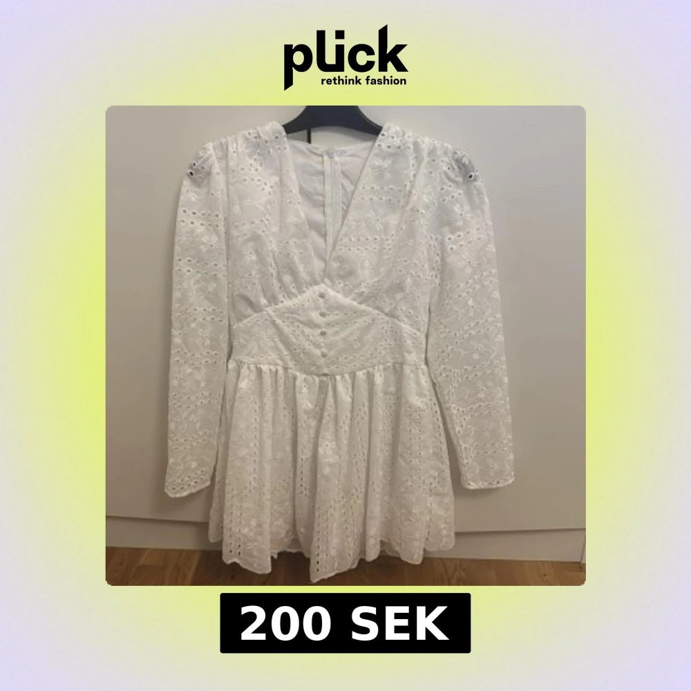 Charmig vit klänning med spetsdetaljer och v-ringad design. Klänningen har långa ärmar och en dragkedja i ryggen. Perfekt för STUDENT👏🍾
