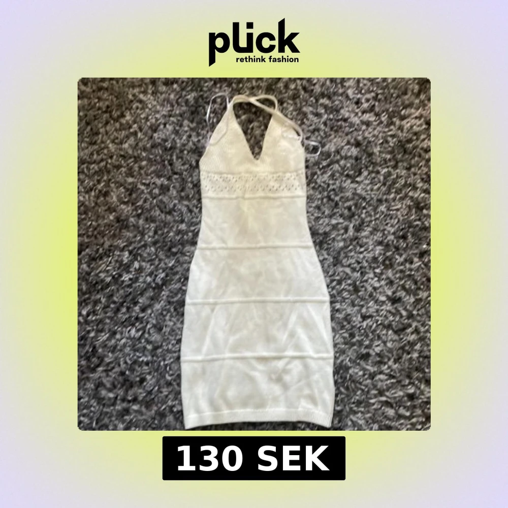 Supersöt vit stickad kortklänning från H&M Divided i storlek XS. Klänningen har halterneck med knyt i nacken, v-ringning och fina håldetaljer upptill. Den är figurnära och passar perfekt för en trendig och fräsch look.