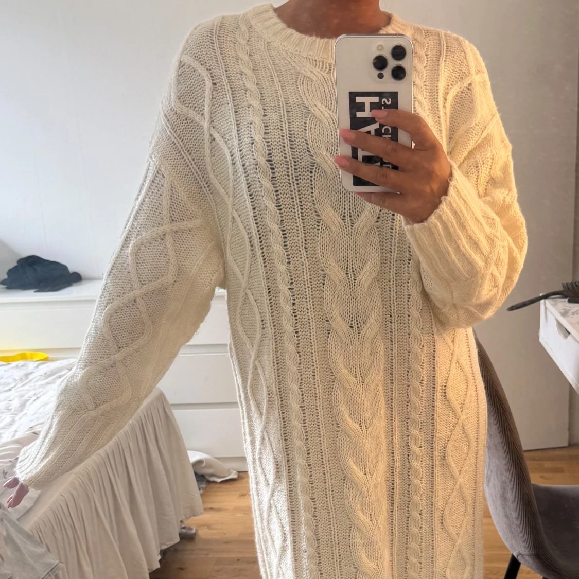 Mysig vit stickad långklänning med grova kabelstickade detaljer framtill och ribbade muddar. Klänningen har lång ärm och en avslappnad, loose passform. Perfekt för dig som vill ha en chill och stilren look.